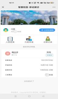 1.进入星空app官网移动校园应用,点击“Y.移动访客”,进入“智慧校园 移动接访”,通过分享申请码或代客申请提交访客申请信息。