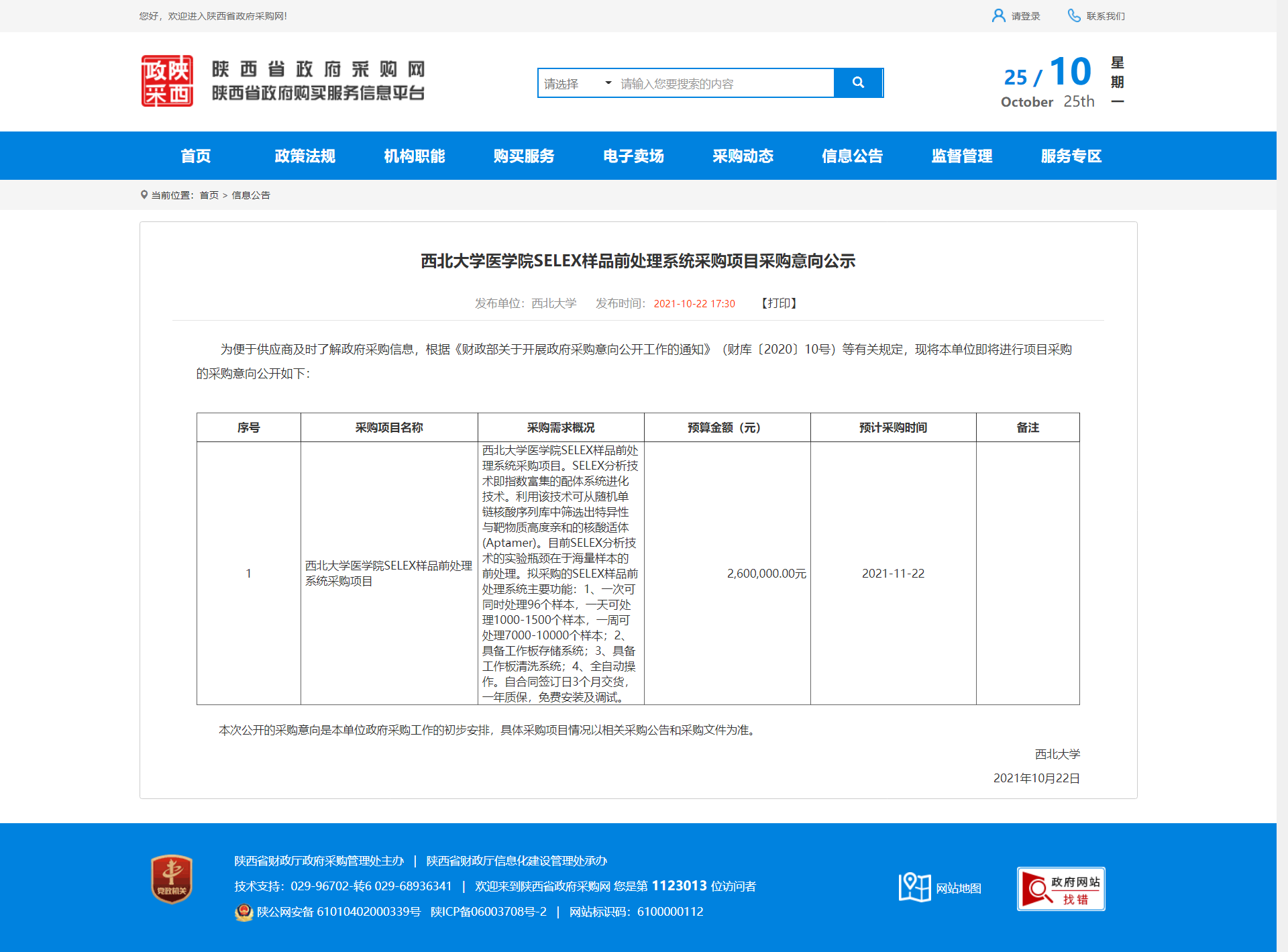 星空app官网医学院SELEX样品前处理系统采购项目采购意向公示 作者: 编辑:薛利娟 时间:2021-10-25 原公告地址:http://www.ccgp-shaanxi.gov.cn/notice/noticeDetail.do?noticeguid=8a85be337c20d0b4017ca7551f1b7c5b