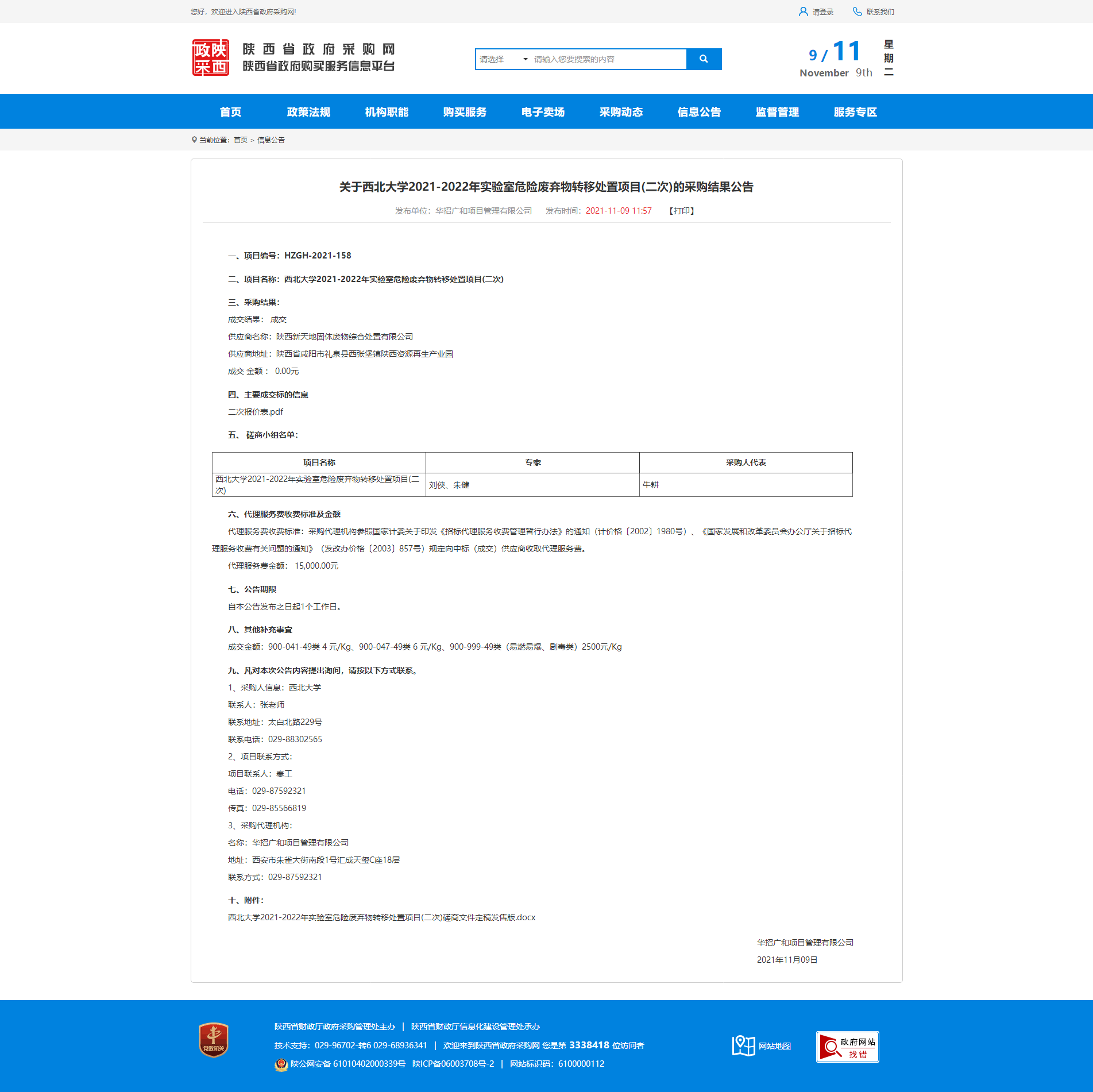 关于星空app官网2021-2022年实验室危险废弃物转移处置项目(二次)的采购结果公告