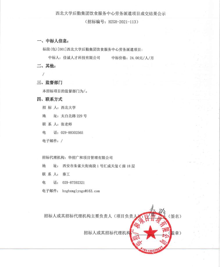 关于星空app官网后勤集团饮食服务中心劳务派遣项目成交结果公告