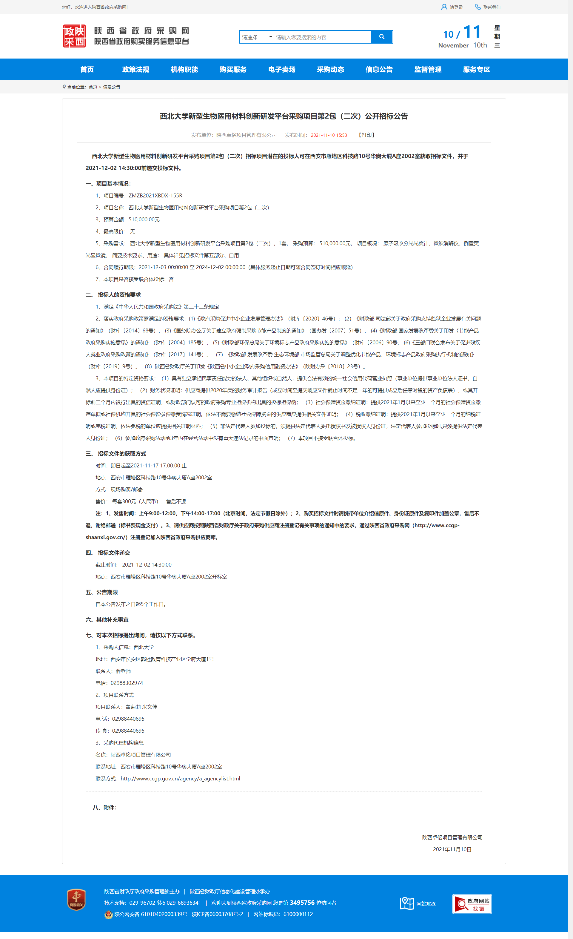 星空app官网新型生物医用材料创新研发平台采购项目第2包(二次)公开招标公告 作者: 编辑:薛利娟 时间:2021-11-10 原公告网址:http://www.ccgp-shaanxi.gov.cn/notice/noticeDetail.do?noticeguid=8a85be347cefc0a5017d07ed8f131470