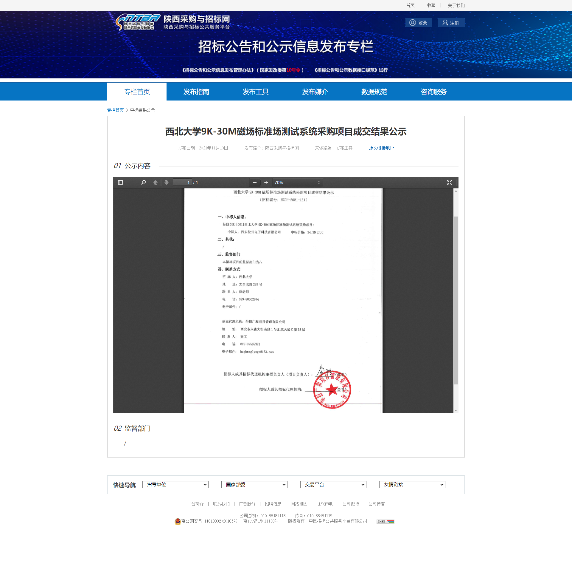 星空app官网9K-30M磁场标准场测试系统采购项目成交结果公示 作者: 编辑:薛利娟 时间:2021-11-11 原公告网址:http://bulletin.sntba.com/resultBulletin/2021-11-10/362788.html
