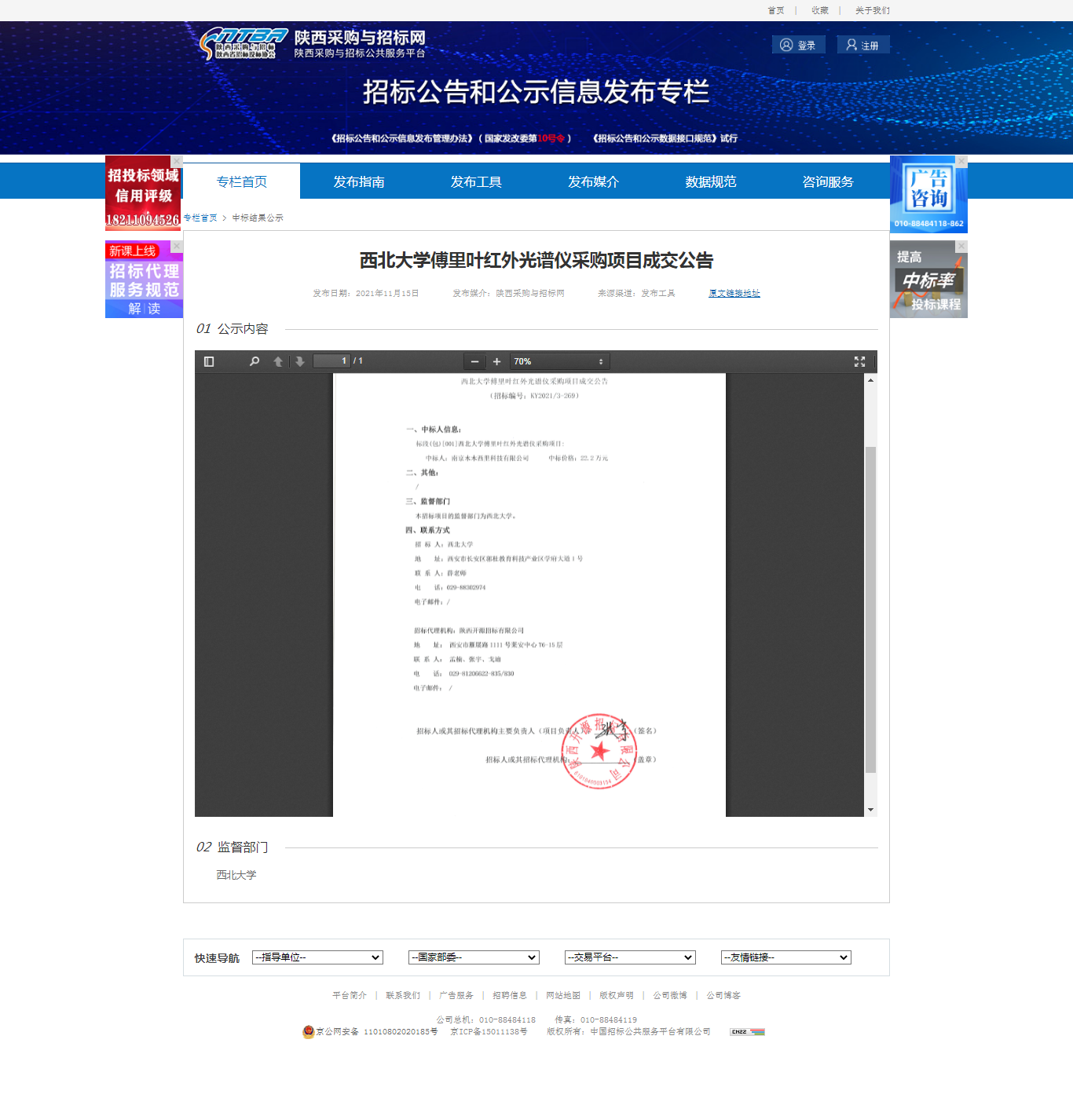 星空app官网傅里叶红外光谱仪采购项目成交公告 作者: 编辑:薛利娟 时间:2021-11-15 原公告网址:http://bulletin.sntba.com/resultBulletin/2021-11-15/363971.html