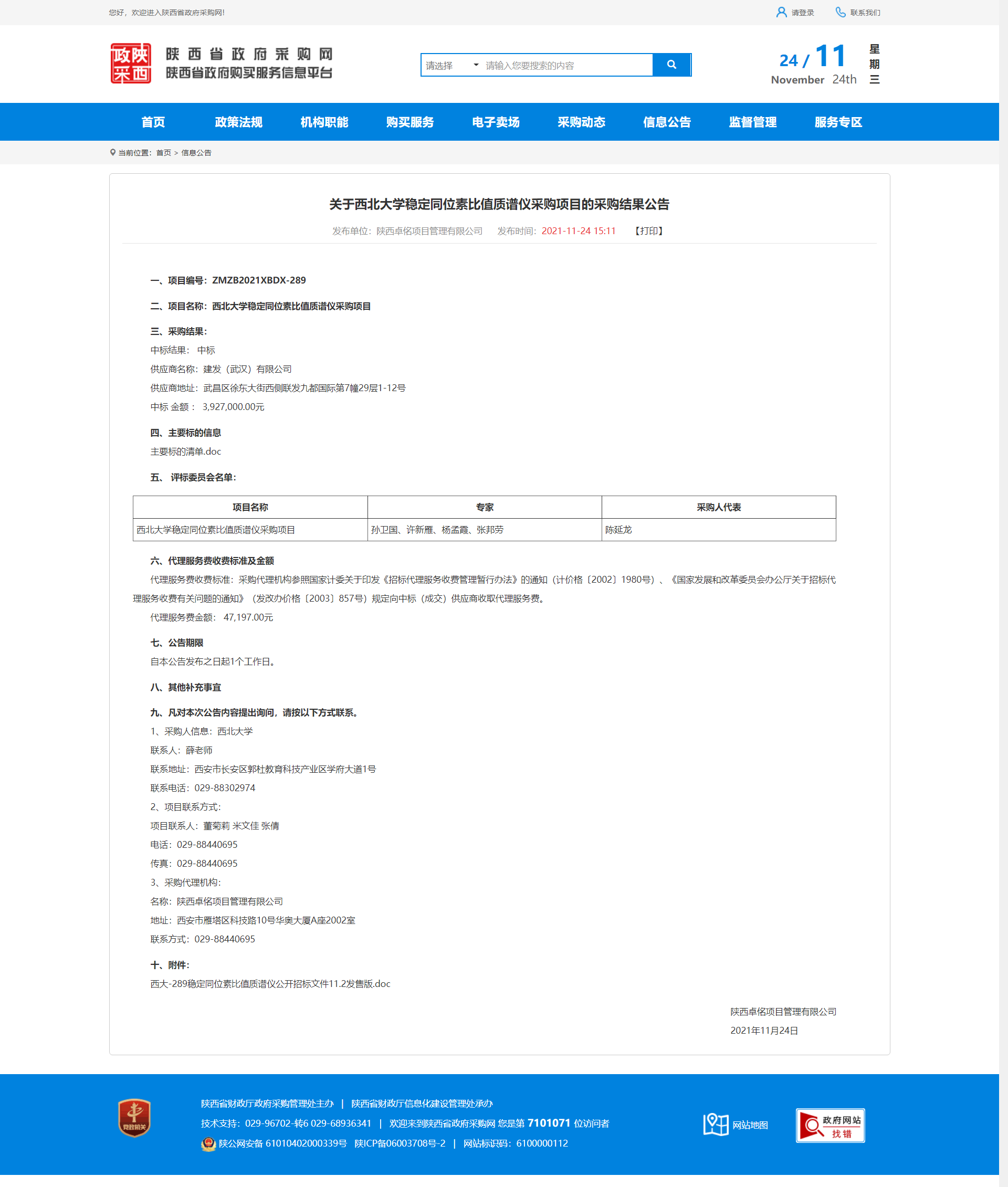 关于星空app官网稳定同位素比值质谱仪采购项目的采购结果公告 作者: 编辑:薛利娟 时间:2021-11-24 原公告网址:http://www.ccgp-shaanxi.gov.cn/notice/noticeDetail.do?noticeguid=8a85be347d2d6f8d017d50c513e326e6