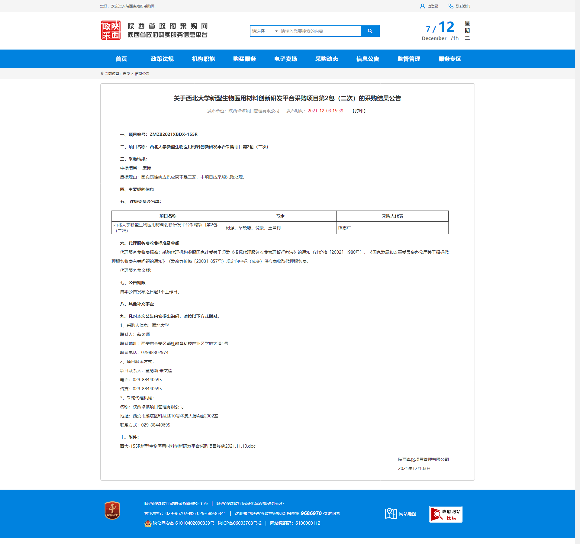 关于星空app官网新型生物医用材料创新研发平台采购项目第2包(二次)的采购结果公告 作者: 编辑:薛利娟 时间:2021-12-07 原公告链接:http://www.ccgp-shaanxi.gov.cn/notice/noticeDetail.do?noticeguid=8a85be347d6a75c8017d7f38c86a62bc