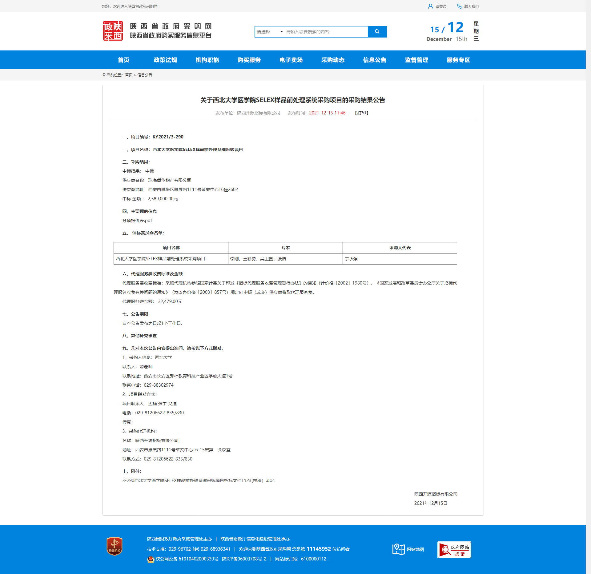 关于星空app官网医学院SELEX样品前处理系统采购项目的采购结果公告 作者: 编辑:薛利娟 时间:2021-12-15 原公告链接:http://www.ccgp-shaanxi.gov.cn/notice/noticeDetail.do?noticeguid=8a85be347dace9e6017dbc2606f522a9