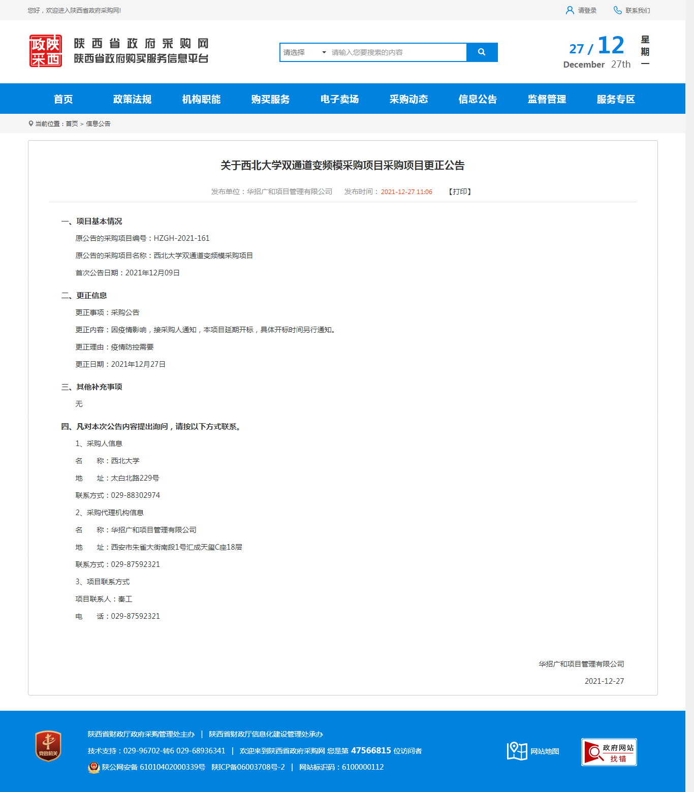 关于星空app官网双通道变频模采购项目采购项目更正公告 作者: 编辑:薛利娟 时间:2021-12-27 原公告链接:http://ccgp-shaanxi.gov.cn/notice/noticeDetail.do?noticeguid=8a85be347dace9e6017dea8c118f786a