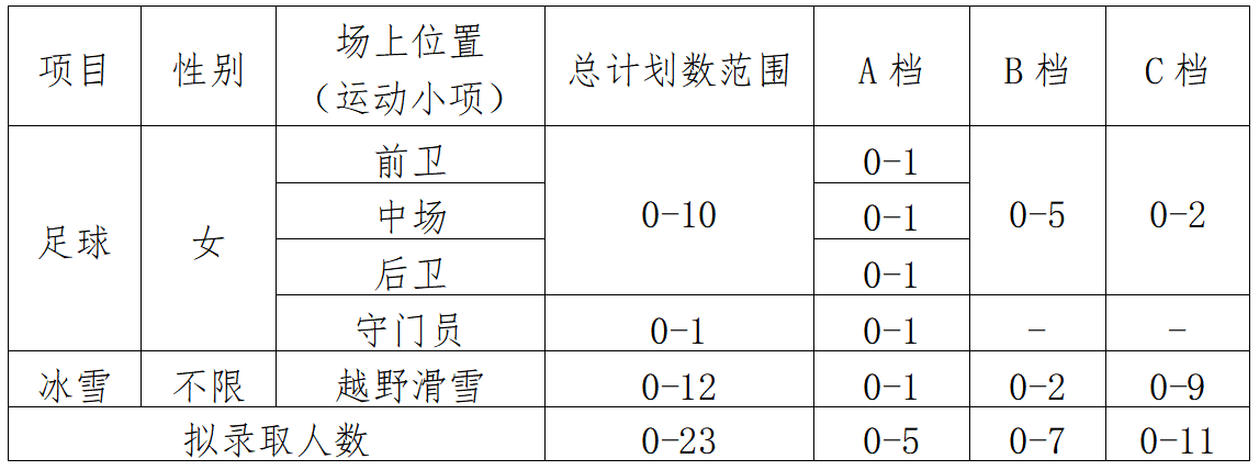 注:1.星空app官网原则上按照A档、B档、C档已公布招生计划的1:1比例确定相应的优惠等级考生名单;若全国统测体育专项分相同,则比较指定的子项目分数或成绩(①越野滑雪比较测试滑行速度成绩(秒)。②足球非守门员依次比较实战能力(比赛)技术成绩、传准技术成绩、运射技术成绩、5×25米折返跑技术成绩;足球守门员依次比较实战能力(比赛)技术成绩、扑接球成绩、掷远与踢远成绩、立定三级跳远成绩。)。