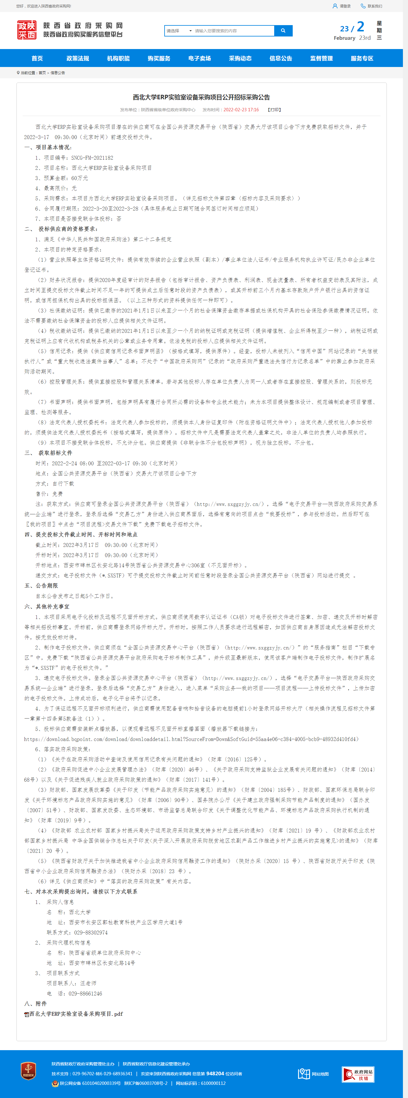 星空app官网ERP实验室设备采购项目公开招标采购公告 作者: 编辑:薛利娟 时间:2022-02-23 原公告链接:http://www.ccgp-shaanxi.gov.cn/notice/noticeDetail.do?noticeguid=8a85be387e22c8ad017f25db42450373