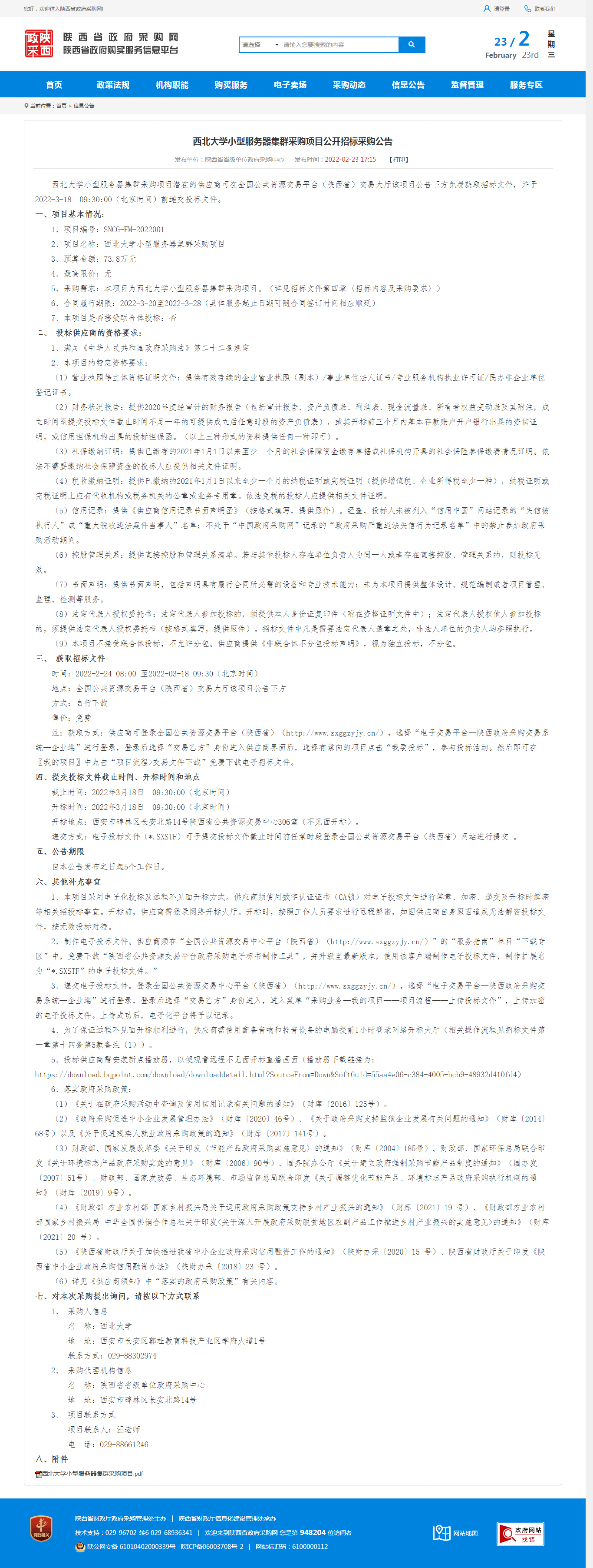 星空app官网小型服务器集群采购项目公开招标采购公告 作者: 编辑:薛利娟 时间:2022-02-23 原公告链接:http://www.ccgp-shaanxi.gov.cn/notice/noticeDetail.do?noticeguid=8a85be387e22c8ad017f25dab58b0372