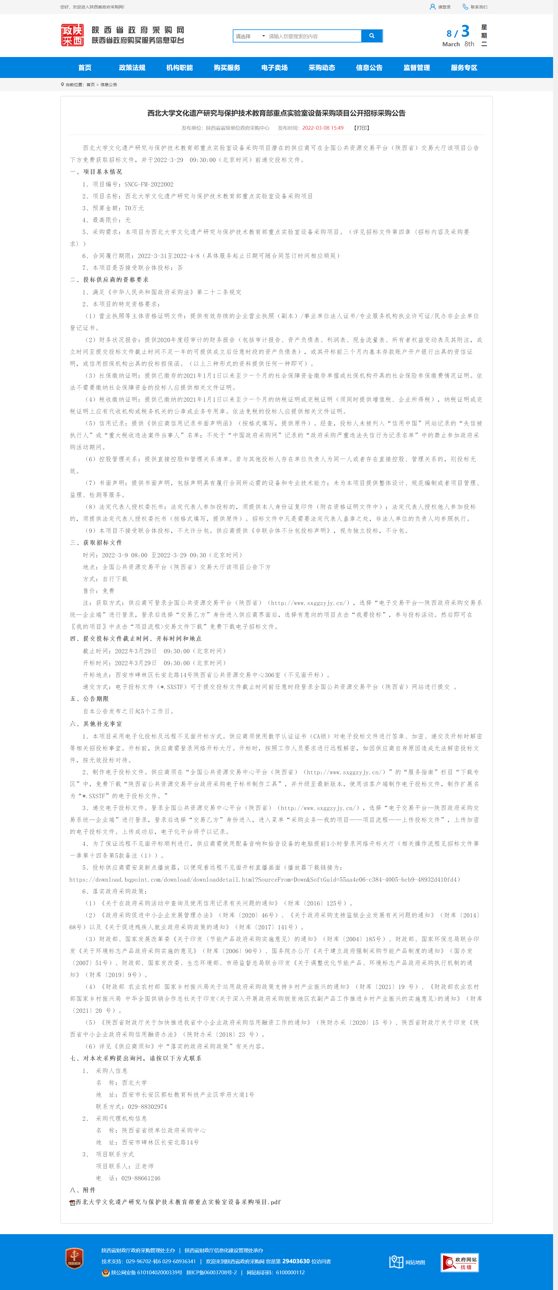 星空app官网文化遗产研究与保护技术教育部重点实验室设备采购项目公开招标采购公告 作者: 编辑:薛利娟 时间:2022-03-08 原公告链接:http://www.ccgp-shaanxi.gov.cn/notice/noticeDetail.do?noticeguid=8a85be387e22c8ad017f687dcc81045b
