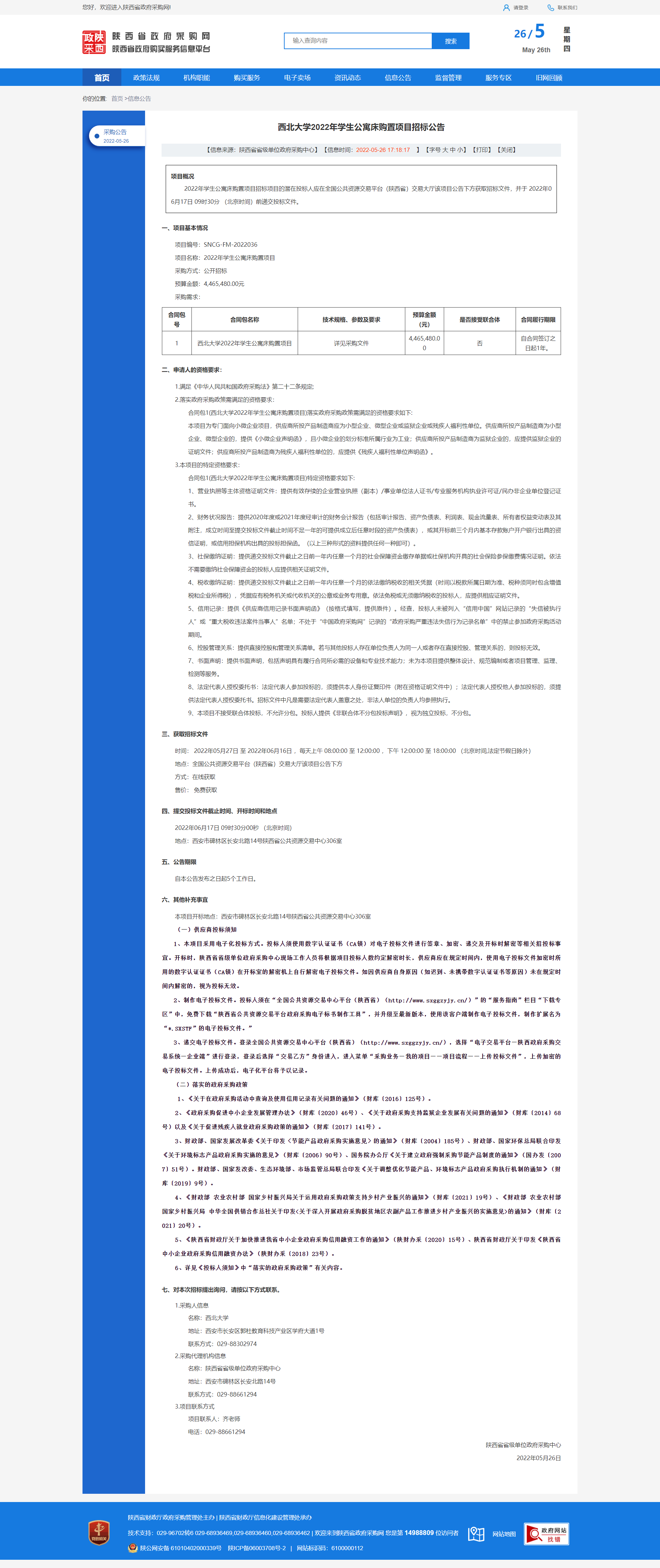 星空app官网2022年学生公寓床购置项目招标公告 作者: 编辑:薛利娟 时间:2022-05-26 原公告链接:http://www.ccgp-shaanxi.gov.cn/freecms/site/shaanxi/ggxx/info/2022/8a69c34a80cf8c1d0180d6127e5a14f4.html?noticeType=001011¬iceId=0697247a-dcd5-11ec-9a8e-08c0eb20c666