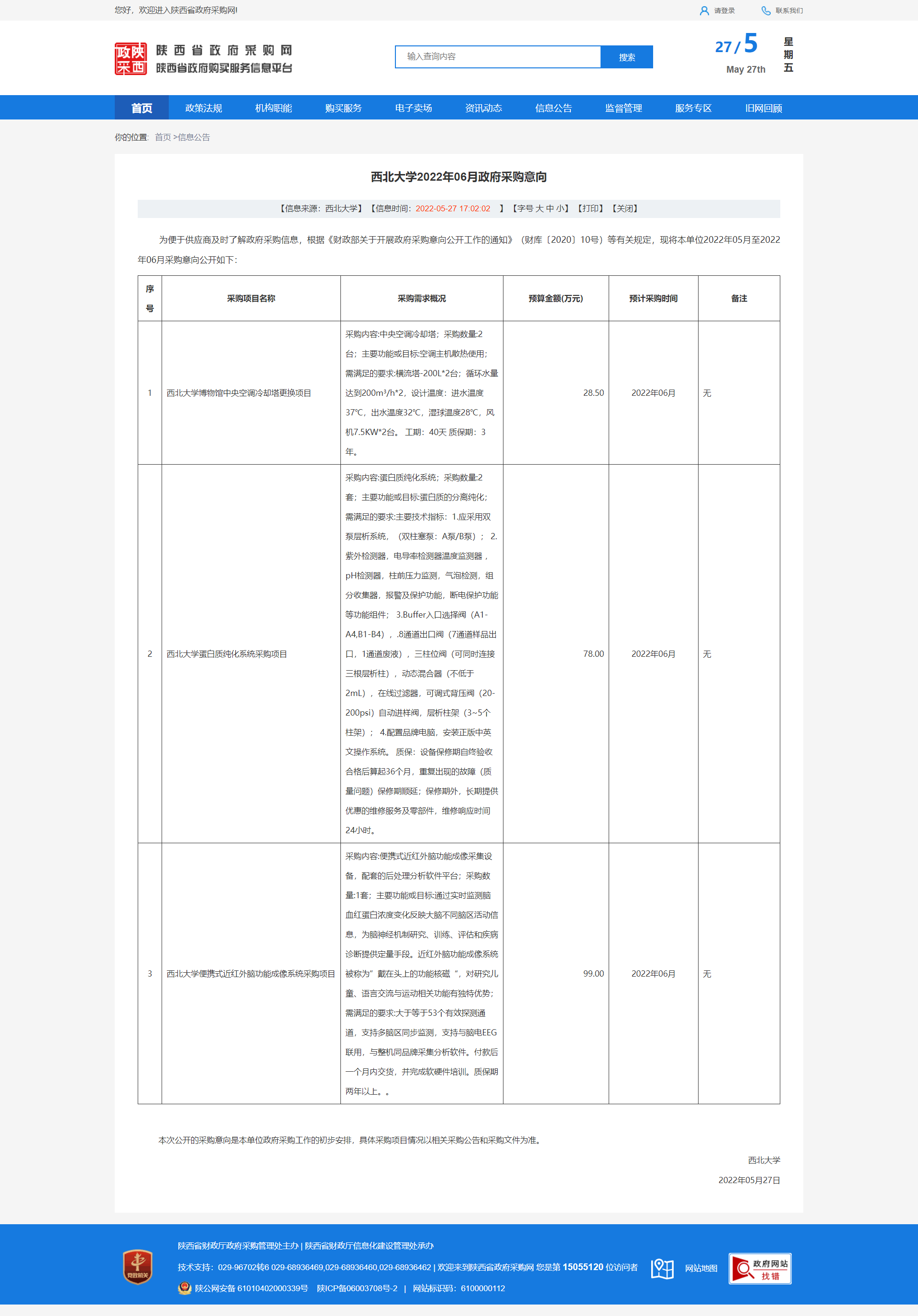 星空app官网2022年06月政府采购意向 作者: 编辑:薛利娟 时间:2022-05-27 原公告链接:http://www.ccgp-shaanxi.gov.cn/freecms/site/shaanxi/ggxx/info/2022/8a69c97180f1b0450180f4b864a96477.html?noticeType=59¬iceId=eba9d16a-dd9b-11ec-9a8e-08c0eb20c666