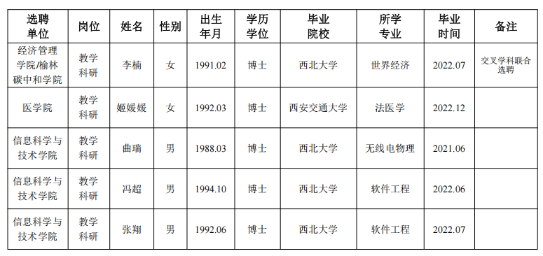 经用人单位及教学督导考核、学校研究,拟同意选聘下列人员来校工作,其聘任关系为A类人事代理。本着公平、公正、公开的原则,现将拟选聘人员基本情况公示如下: