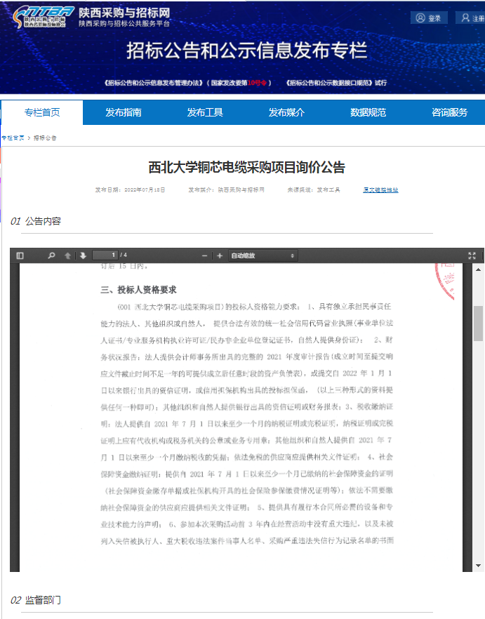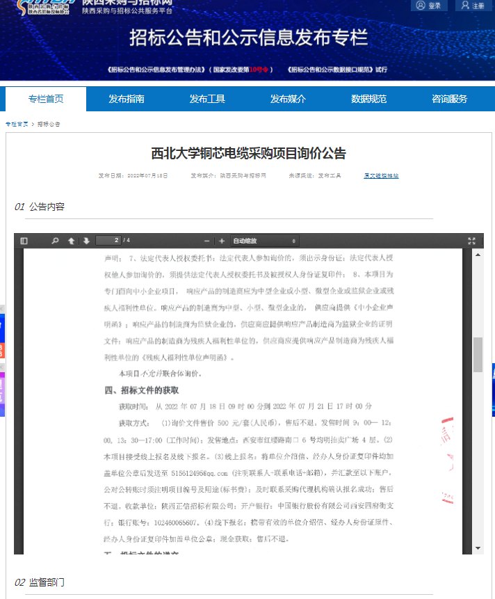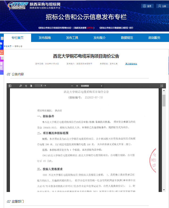 星空app官网铜芯电缆采购项目询价公告 作者: 编辑:薛利娟 时间:2022-07-18 原公告链接:http://bulletin.sntba.com/biddingBulletin/2022-07-18/449060.html
