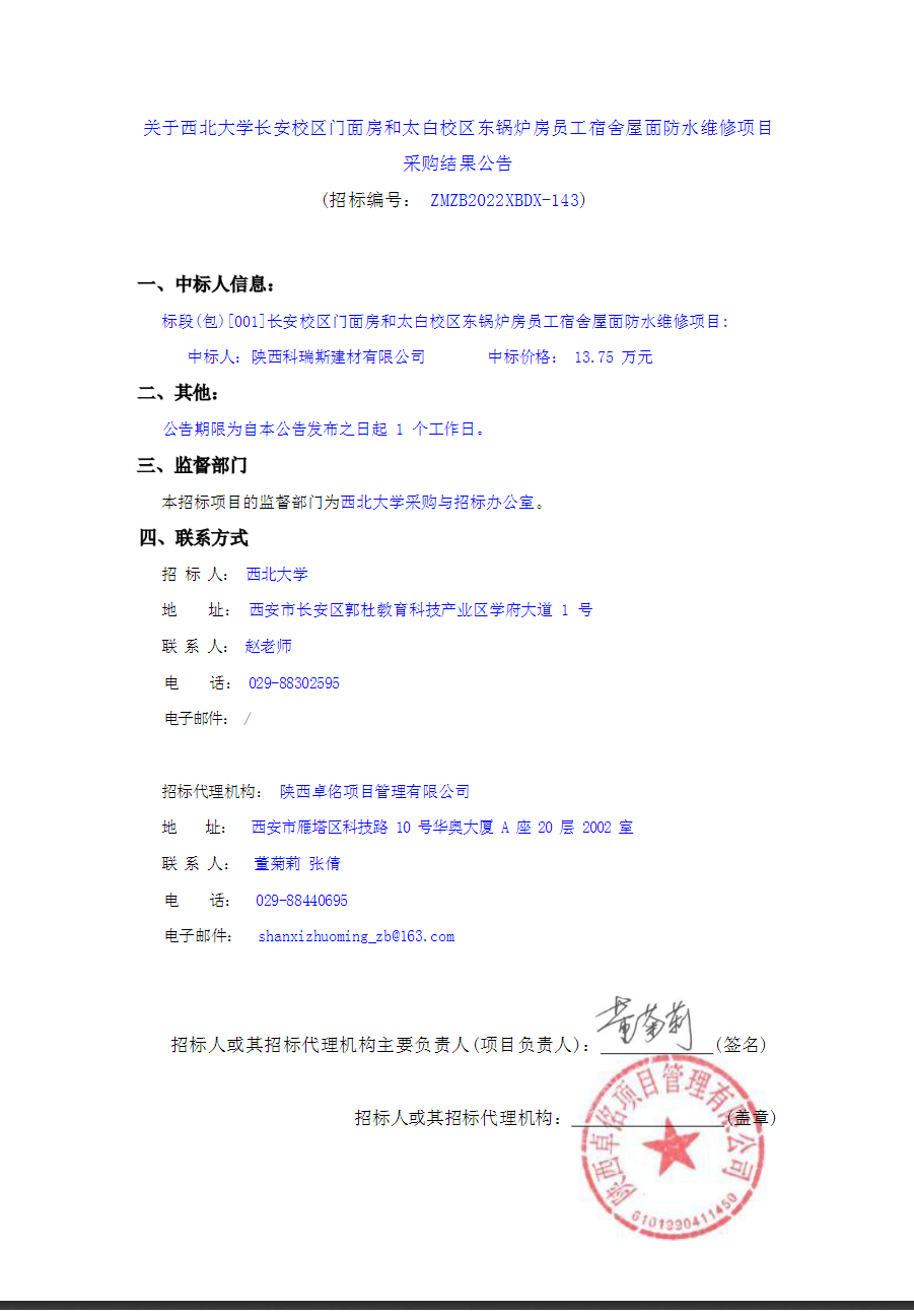 关于星空app官网长安校区门面房和太白校区东锅炉房员工宿舍屋面防水维修项目采购结果公告