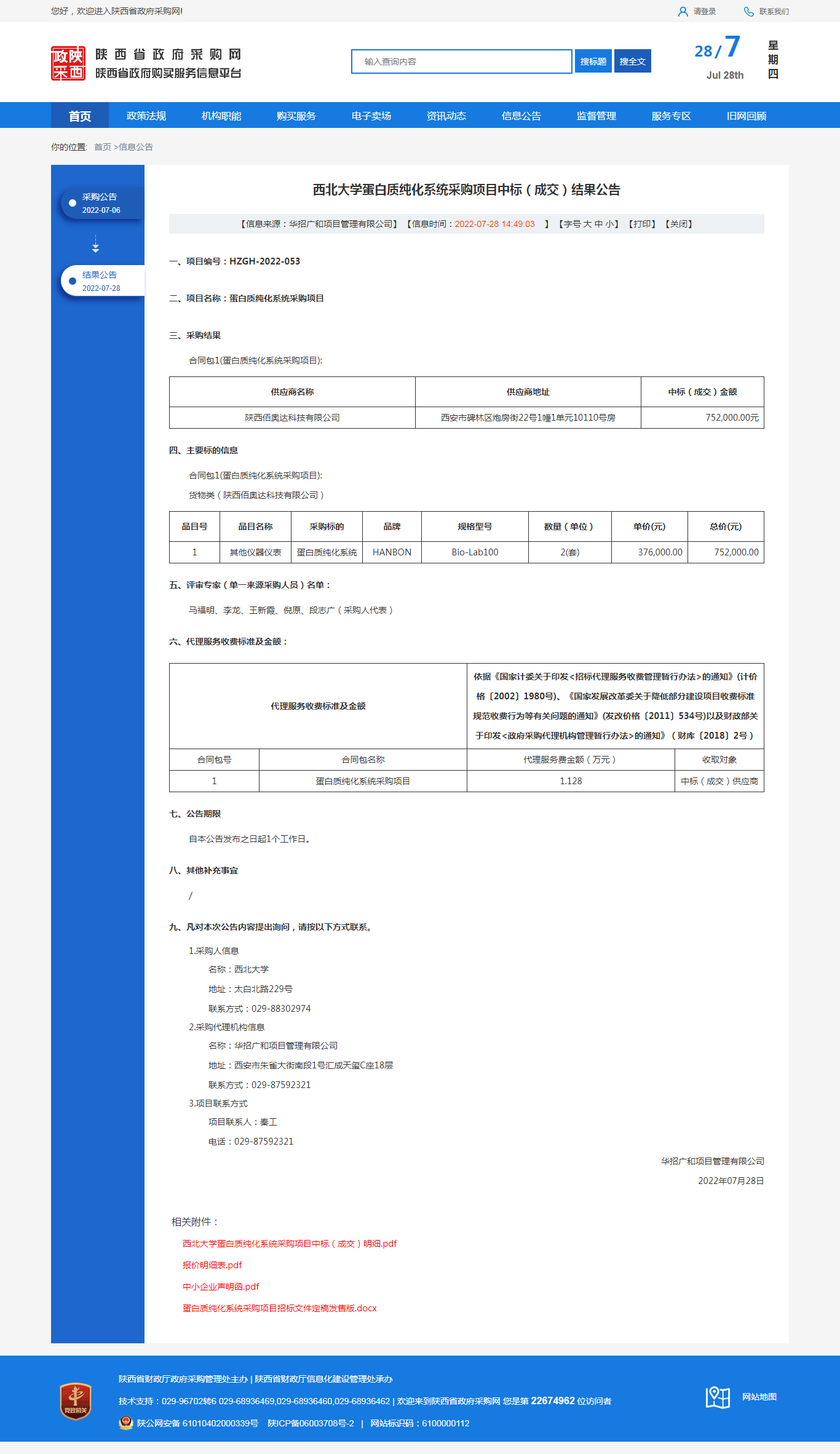 星空app官网蛋白质纯化系统采购项目中标(成交)结果公告 作者: 编辑:采购与招标办公室 时间:2022-07-28 原公告链接:http://www.ccgp-shaanxi.gov.cn/freecms/site/shaanxi/ggxx/info/2022/8a69c0168238f2d801824386c2a86160.html?noticeType=001021¬iceId=c4ccf243-0e41-11ed-9a8e-08c0eb20c666