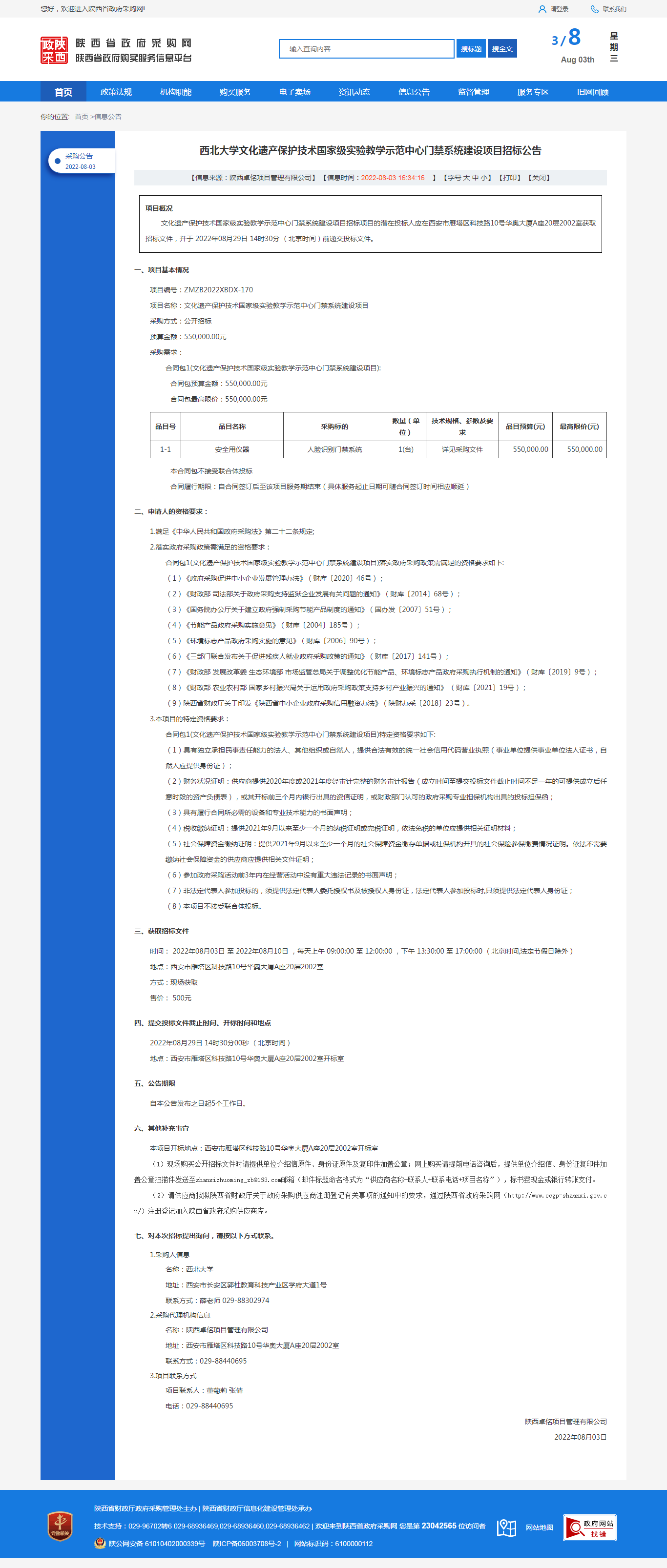 星空app官网文化遗产保护技术国家级实验教学示范中心门禁系统建设项目招标公告 作者: 编辑:采购与招标办公室 时间:2022-08-03 原公告链接:http://www.ccgp-shaanxi.gov.cn/freecms/site/shaanxi/ggxx/info/2022/8a69c15f8238f00c01826158874944be.html?noticeType=001011¬iceId=795f6845-1307-11ed-9a8e-08c0eb20c666