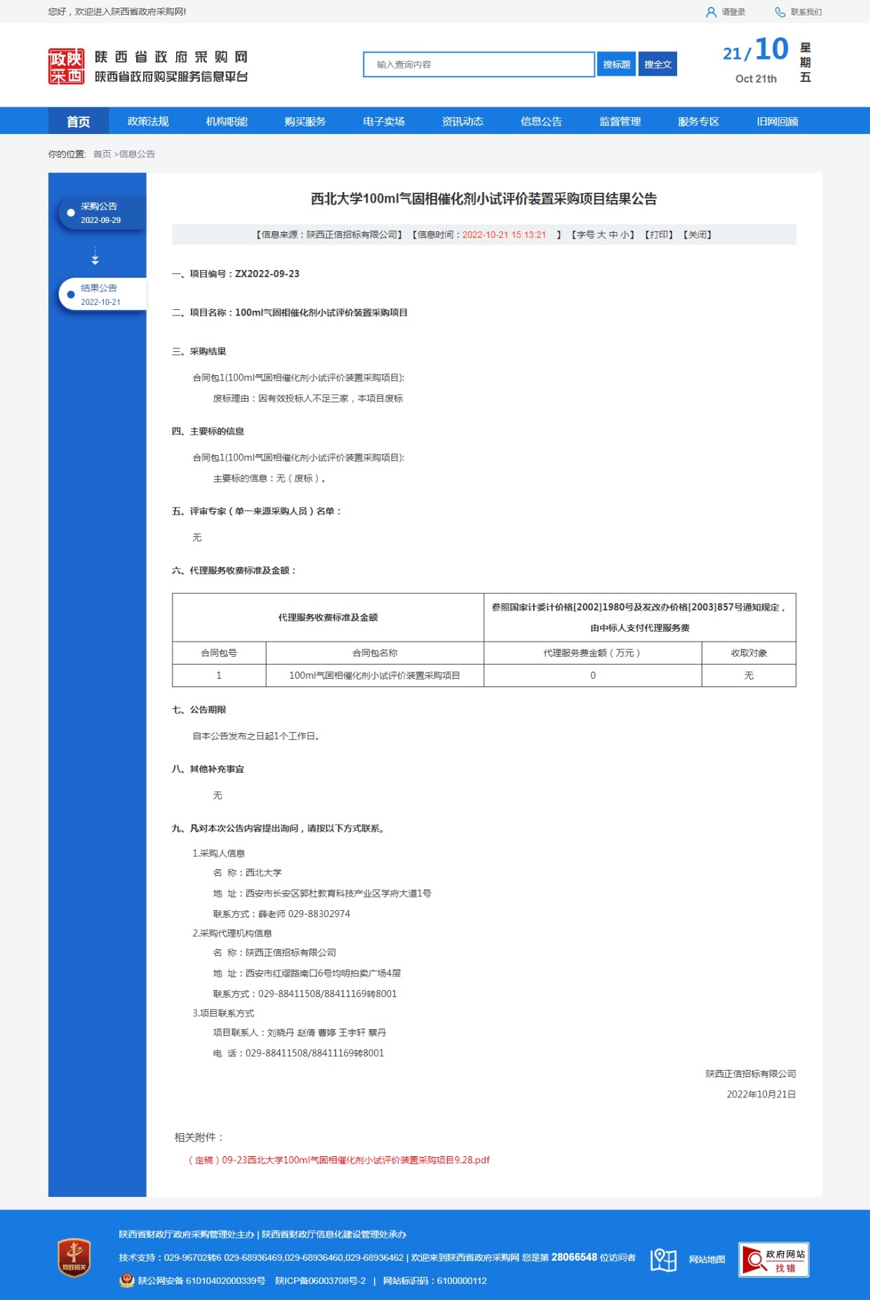 星空app官网100ml气固相催化剂小试评价装置采购项目结果公告 作者: 编辑:采购与招标办公室 时间:2022-10-21 原公告链接:http://www.ccgp-shaanxi.gov.cn/freecms/site/shaanxi/ggxx/info/2022/8a69c29183b278190183f9504bd56da6.html?noticeType=001006¬iceId=6e4daf58-5110-11ed-9a8e-08c0eb20c666