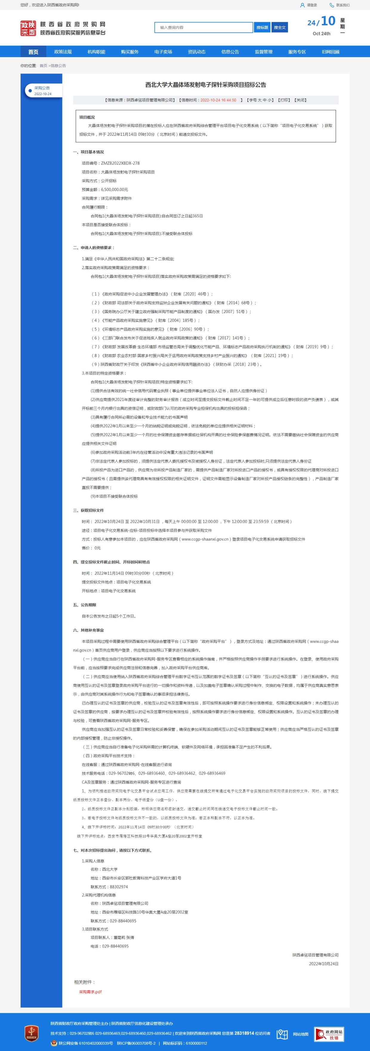 星空app官网大晶体场发射电子探针采购项目招标公告 作者: 编辑:采购与招标办公室 时间:2022-10-24 原公告链接:http://www.ccgp-shaanxi.gov.cn/freecms/site/shaanxi/ggxx/info/2022/8a69c0398405ac32018408c2f6bb39d0.html?noticeType=001011¬iceId=b7d9a3a3-5378-11ed-9a8e-08c0eb20c666