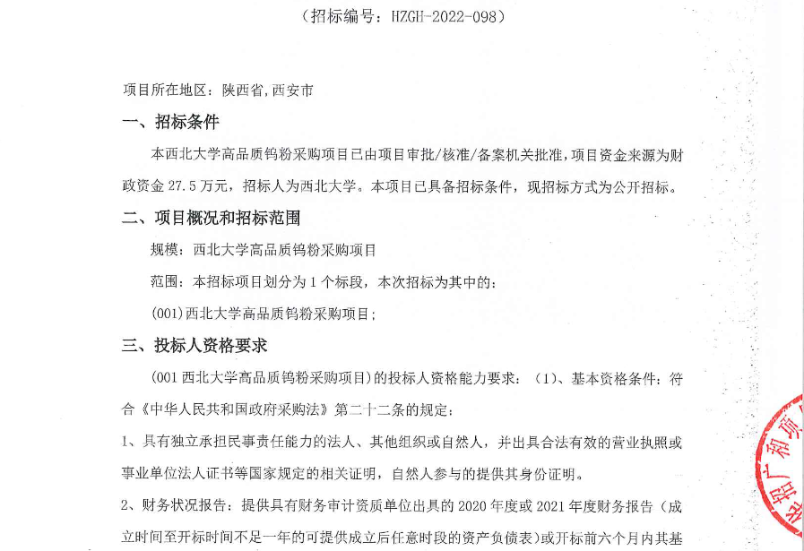 星空app官网高品质钨粉采购项目公开招标公告 作者: 编辑:采购与招标办公室 时间:2022-11-23 原公告链接:http://bulletin.sntba.com/biddingBulletin/2022-11-23/502149.html