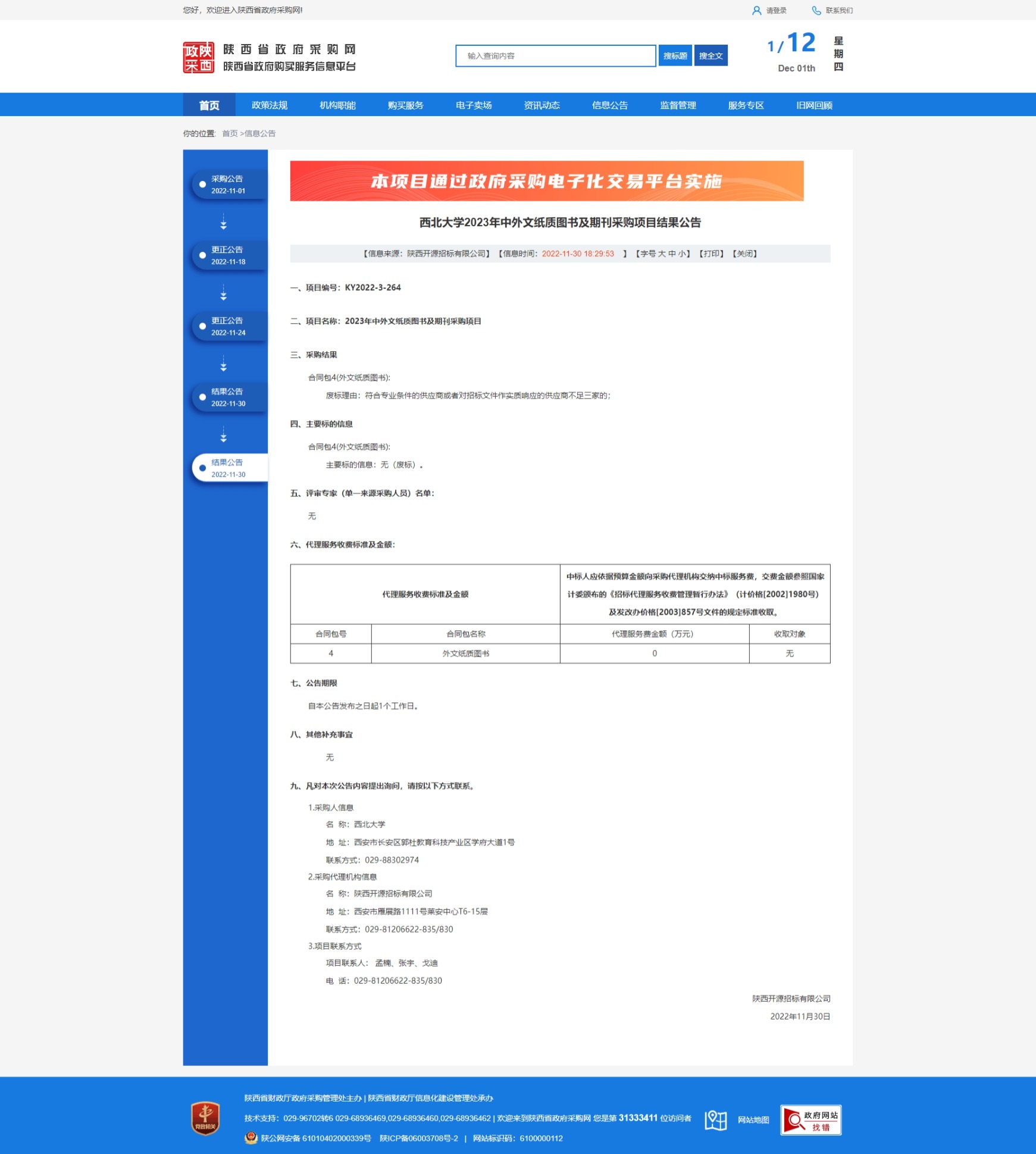 星空app官网2023年中外文纸质图书及期刊采购项目结果公告(第4包) 作者: 编辑:采购与招标办公室 时间:2022-12-01 原公告链接:http://www.ccgp-shaanxi.gov.cn/freecms/site/shaanxi/ggxx/info/2022/8a69c8558405a9700184c8053d036584.html?noticeType=001006¬iceId=985a6065-709a-11ed-9a8e-08c0eb20c666