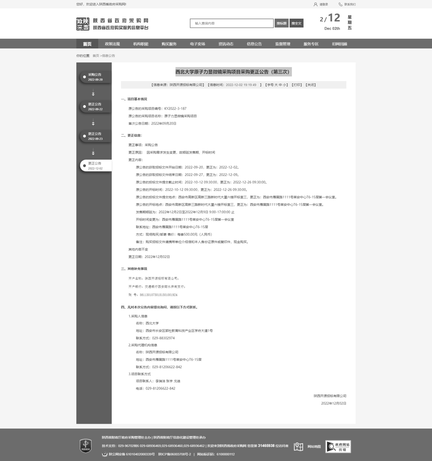 星空app官网原子力显微镜采购项目采购更正公告(第三次) 作者: 编辑:采购与招标办公室 时间:2022-12-02 原公告链接:http://www.ccgp-shaanxi.gov.cn/freecms/site/shaanxi/ggxx/info/2022/8a69c4c88405ac2f0184d27d406137d7.html?noticeType=001031¬iceId=e90e6533-7233-11ed-9a8e-08c0eb20c666