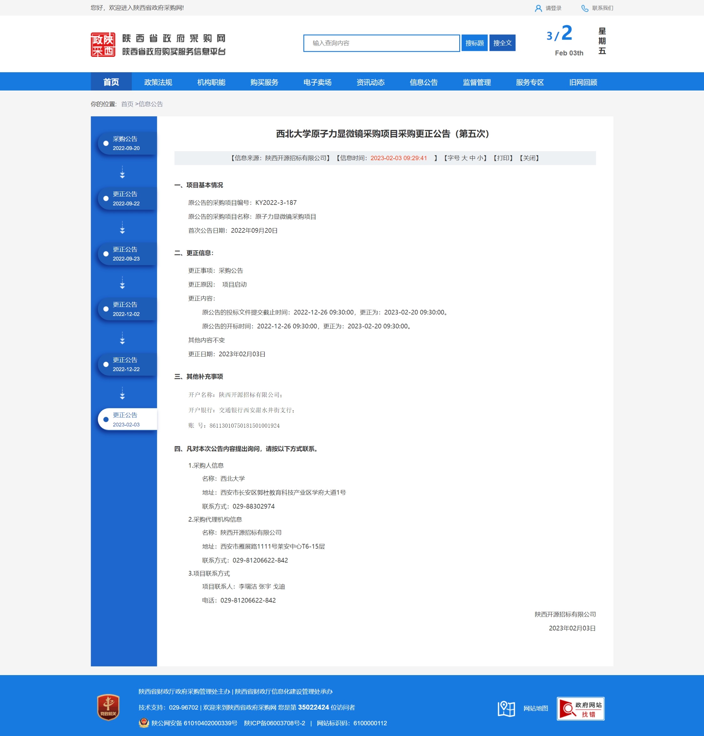 星空app官网原子力显微镜采购项目采购更正公告 作者: 编辑:采购与招标办公室 时间:2023-02-03 原公告链接:http://www.ccgp-shaanxi.gov.cn/freecms/site/shaanxi/ggxx/info/2023/8a69c875858179a7018614dfbb5c2585.html?noticeType=001031¬iceId=09c0ceef-a363-11ed-9a8e-08c0eb20c666