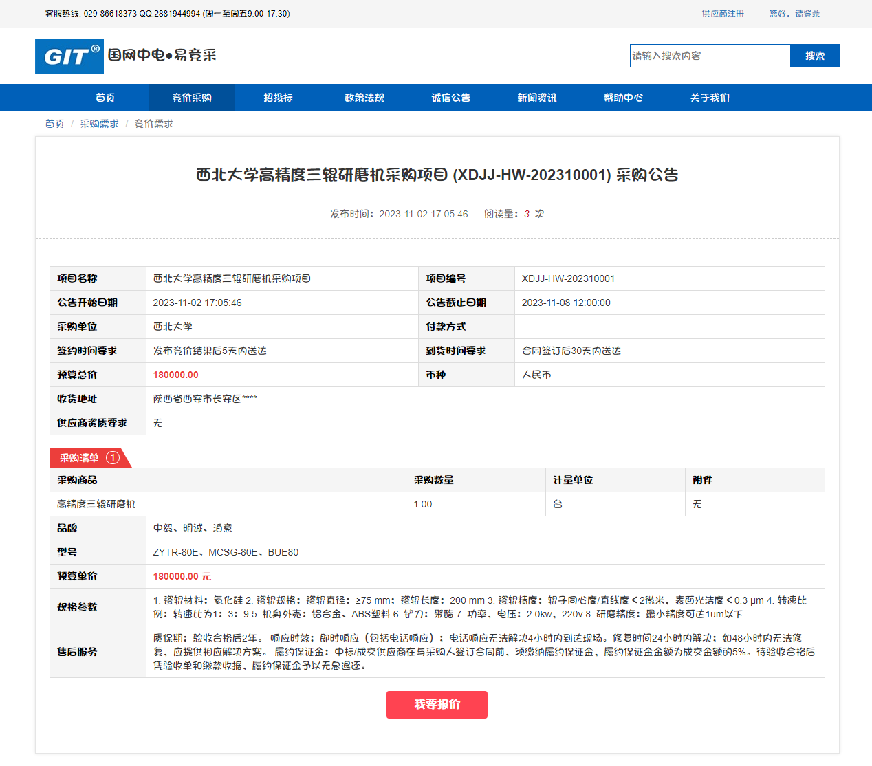 星空app官网高精度三辊研磨机采购项目竞价公告