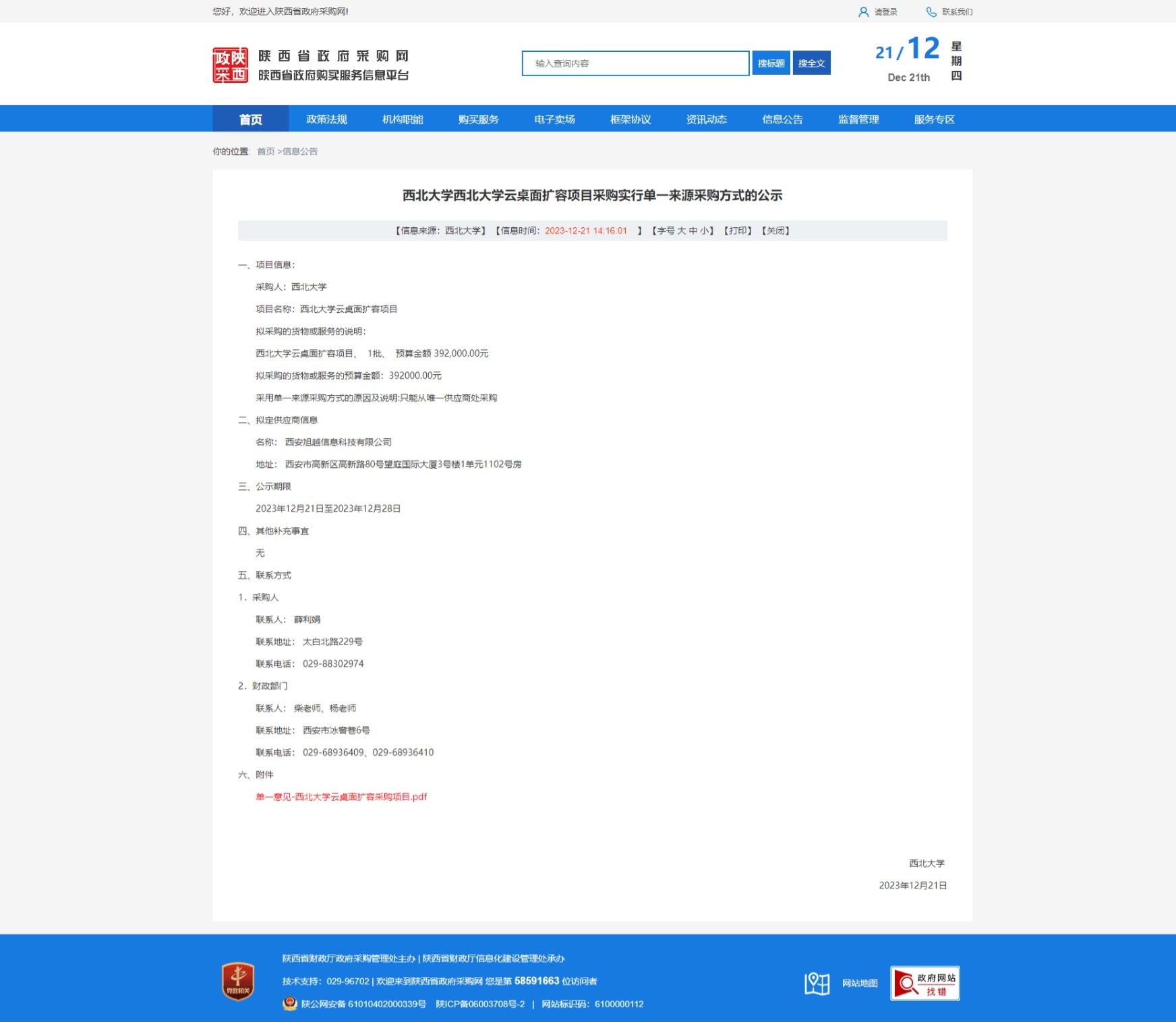 星空app官网云桌面扩容项目采购实行单一来源采购方式的公示 作者: 编辑:采购与招标办公室 时间:2023-12-21 原公告链接:http://www.ccgp-shaanxi.gov.cn/freecms/site/shaanxi/ggxx/info/2023/8a69c16c8c86bcea018c8afd06910a33.html?noticeType=001051¬iceId=dae76602-9fc9-11ee-9a8e-08c0eb20c666