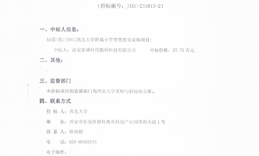 星空app官网附属小学智慧教室采购项目(二次)中标结果公告 作者: 编辑:采购与招标办公室 时间:2024-03-05 原公告链接:http://bulletin.sntba.com/resultBulletin/2024-03-05/1173145.html