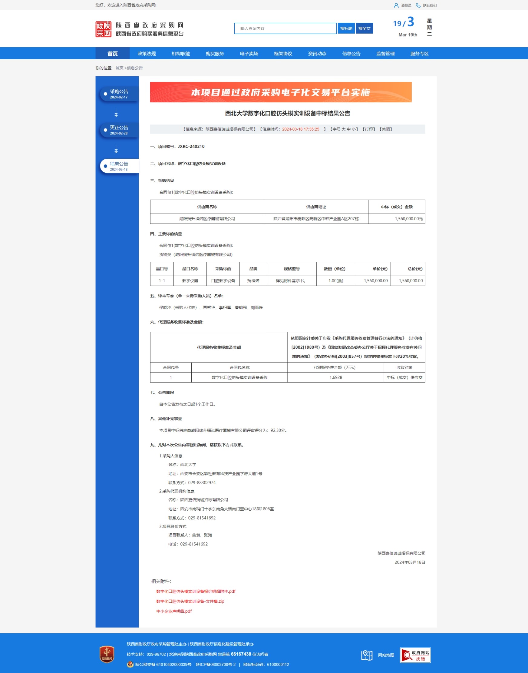 星空app官网数字化口腔仿头模实训设备中标结果公告 作者: 编辑:采购与招标办公室 时间:2024-03-19 原公告链接:https://www.ccgp-shaanxi.gov.cn/freecms/site/shaanxi/ggxx/info/2024/8a69c7f58e463d37018e50cd061a2aef.html?noticeType=001021¬iceId=fbf978e2-e50b-11ee-b8b6-08c0eb20c666