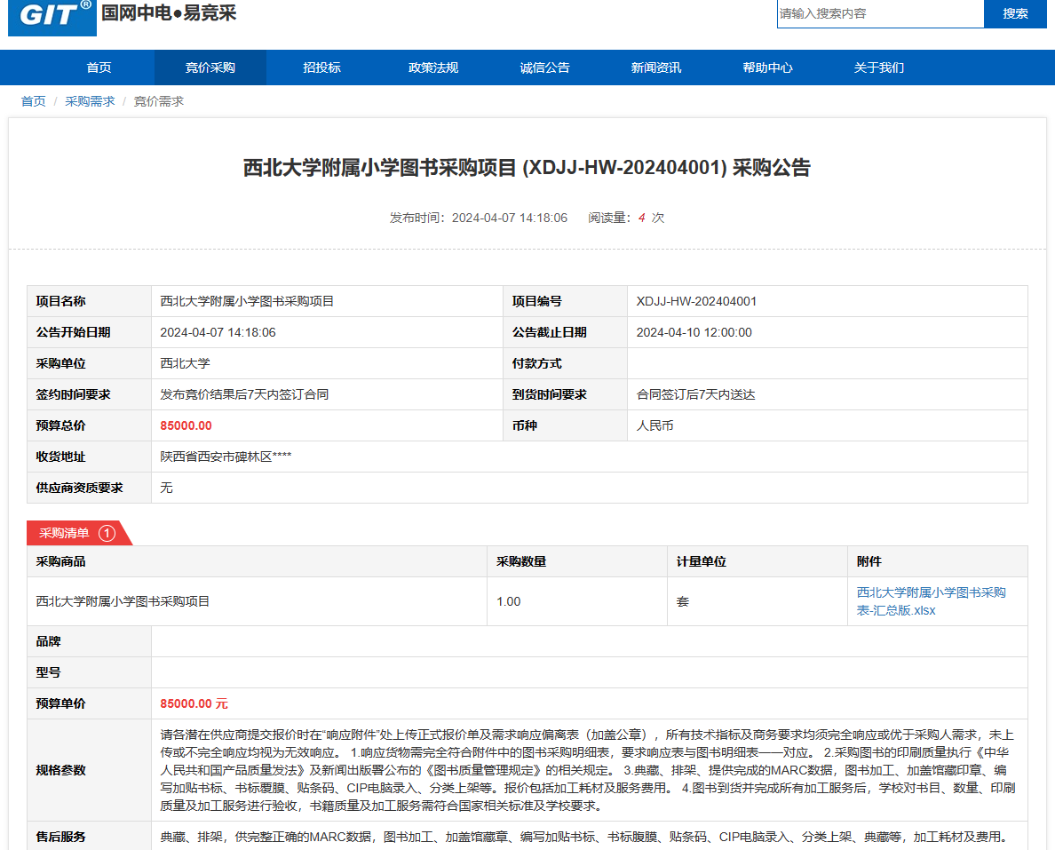 星空app官网附属小学图书采购项目 (XDJJ-HW-202404001) 竞价公告 作者: 编辑: 时间:2024-04-07 原公告链接:https://www.ejingcai.com.cn/site/bidding/detail/9303