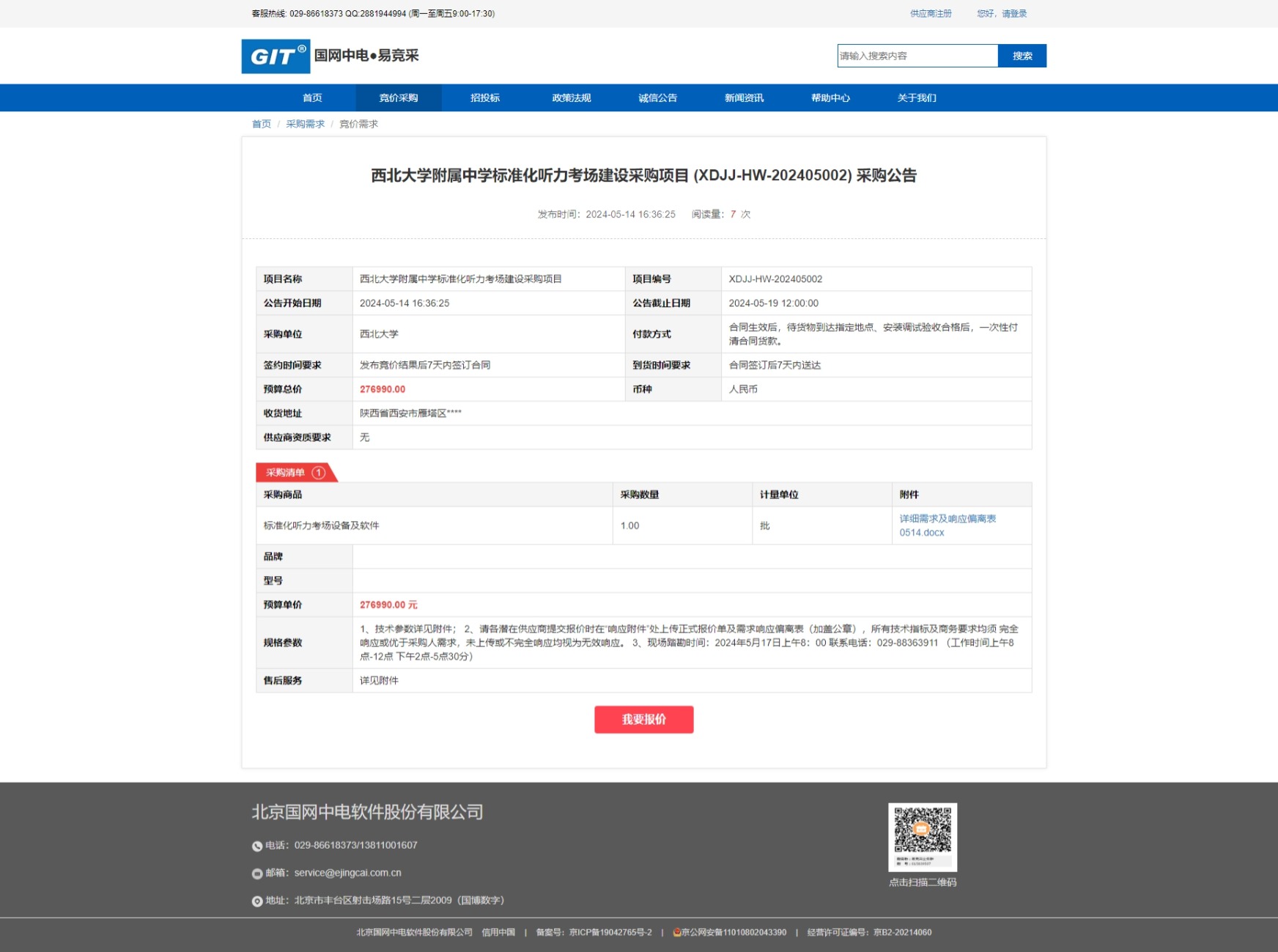 星空app官网附属中学标准化听力考场建设采购项目 (XDJJ-HW-202405002) 竞价采购公告 作者: 编辑:采购与招标办公室 时间:2024-05-14 原公告链接:https://www.ejingcai.com.cn/site/bidding/detail/10191
