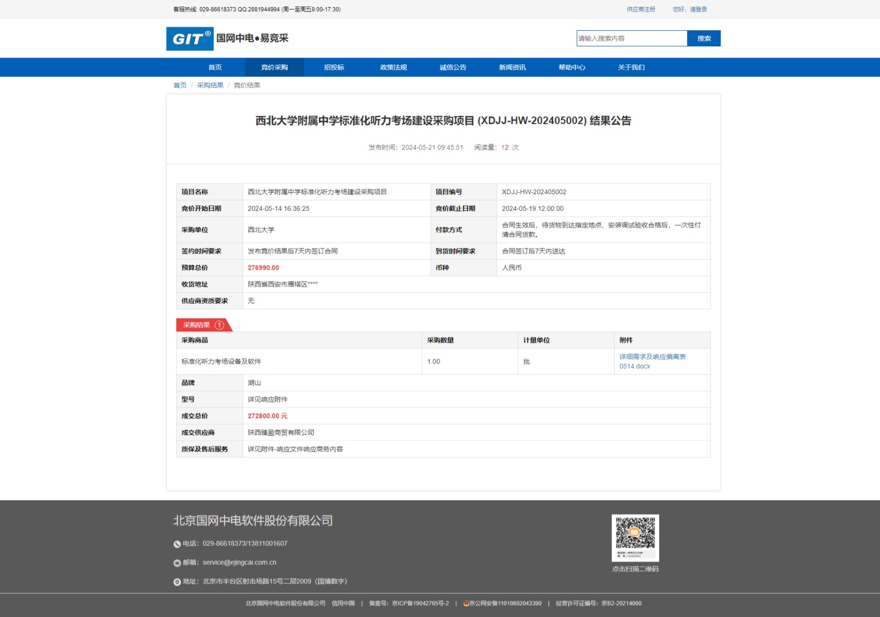 星空app官网附属中学标准化听力考场建设采购项目 (XDJJ-HW-202405002)竞价 结果公告 作者: 编辑:采购与招标办公室 时间:2024-05-21 原公告链接:https://www.ejingcai.com.cn/site/bidding/detail/10341