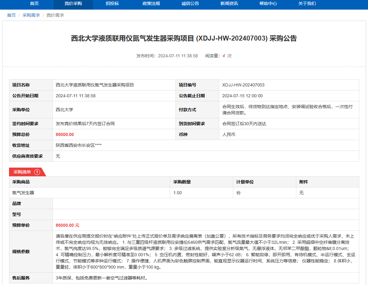 星空app官网液质联用仪氮气发生器采购项目 (XDJJ-HW-202407003) 竞价采购公告 作者: 编辑: 时间:2024-07-11 原公告链接:https://www.ejingcai.com.cn/site/bidding/detail/11611