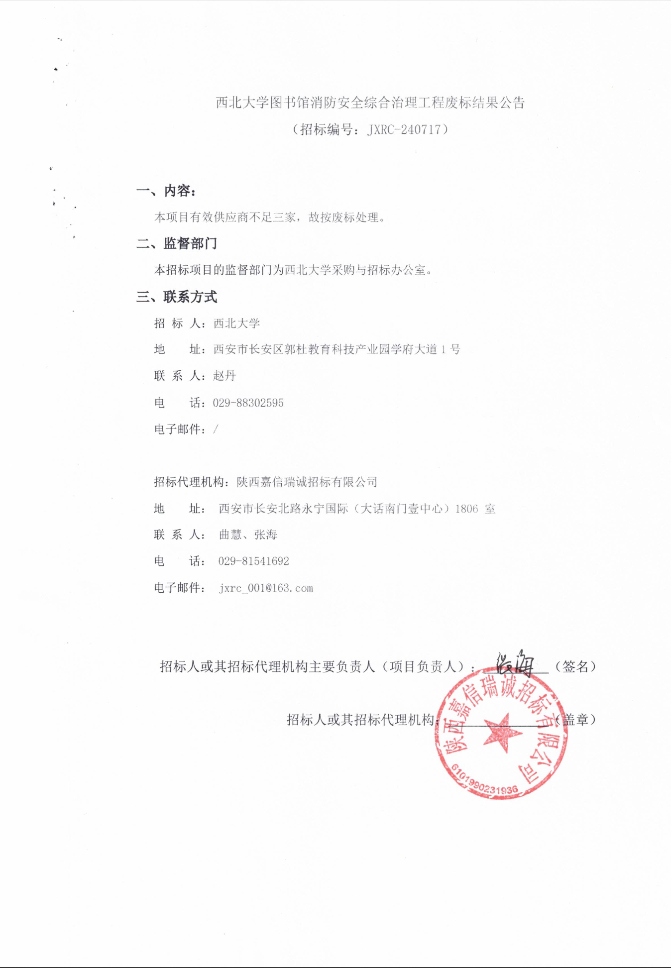 星空app官网图书馆消防安全综合治理工程废标结果公告
