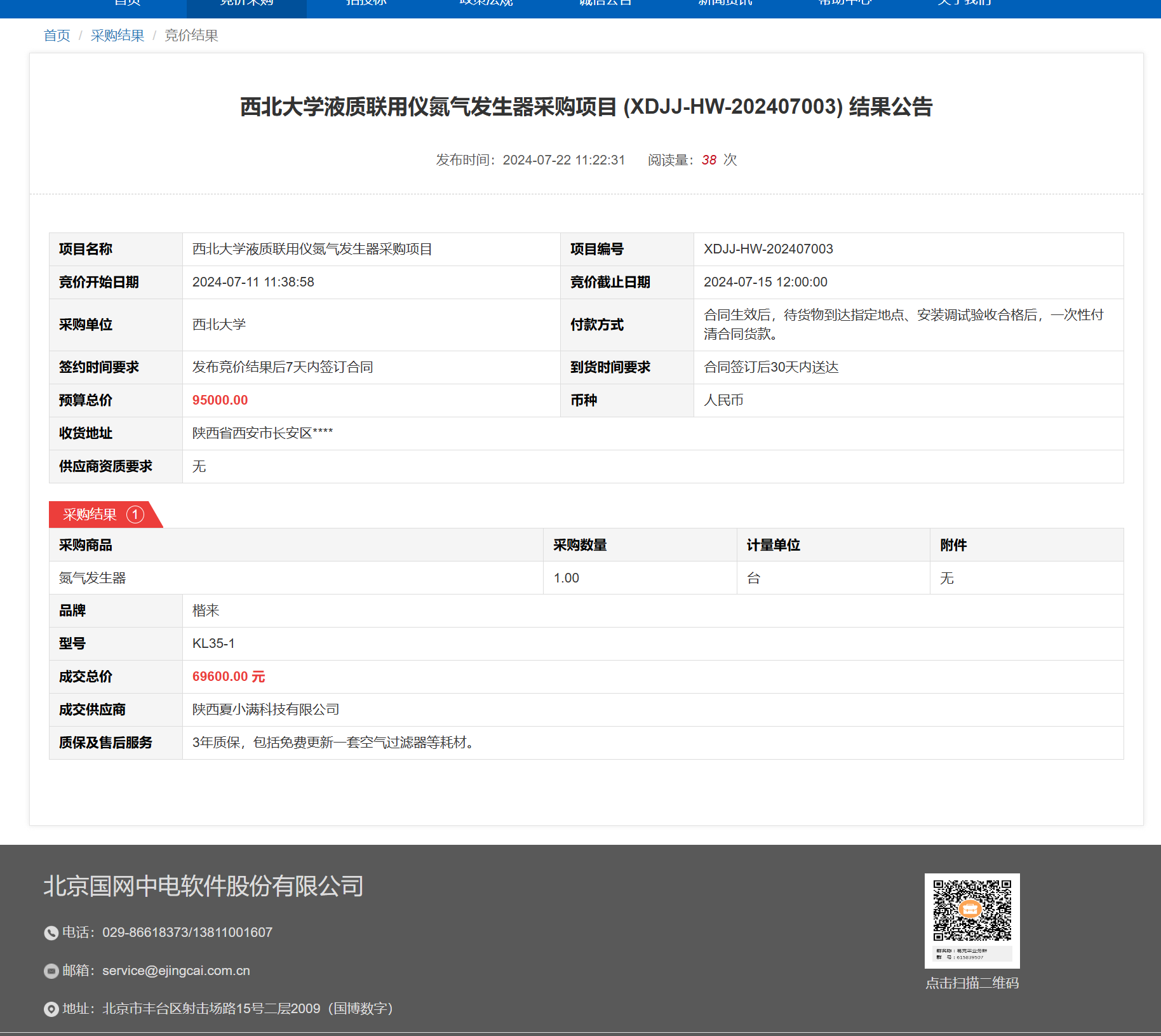 星空app官网液质联用仪氮气发生器采购项目 (XDJJ-HW-202407003) 竞价结果公告 作者: 编辑: 时间:2024-07-23 原公告链接:https://www.ejingcai.com.cn/site/bidding/detail/11793