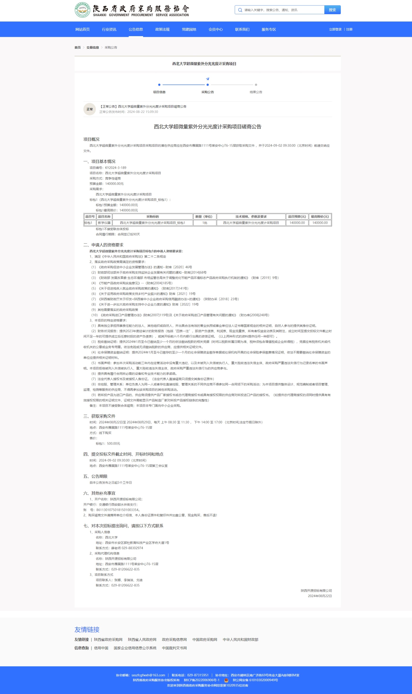 星空app官网超微量紫外分光光度计采购项目磋商公告 作者: 编辑:采购与招标办公室 时间:2024-08-23 原公告链接:https://www.sxszfcgfwxh.cn/#/tender-vTradeAnnouncement-anno?tenderProjectId=1826435442958446594&rootId=1549250743389216770