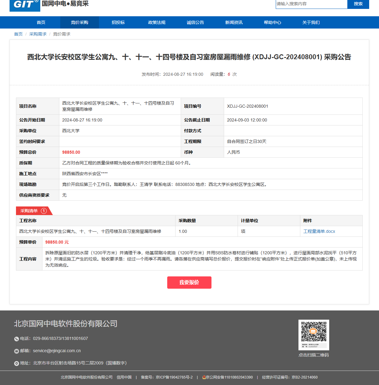 星空app官网长安校区学生公寓九、十、十一、十四号楼及自习室房屋漏雨维修 (XDJJ-GC-202408001) 竞价采购公告 作者: 编辑: 时间:2024-08-27 原公告链接:https://www.ejingcai.com.cn/site/bidding/detail/12232
