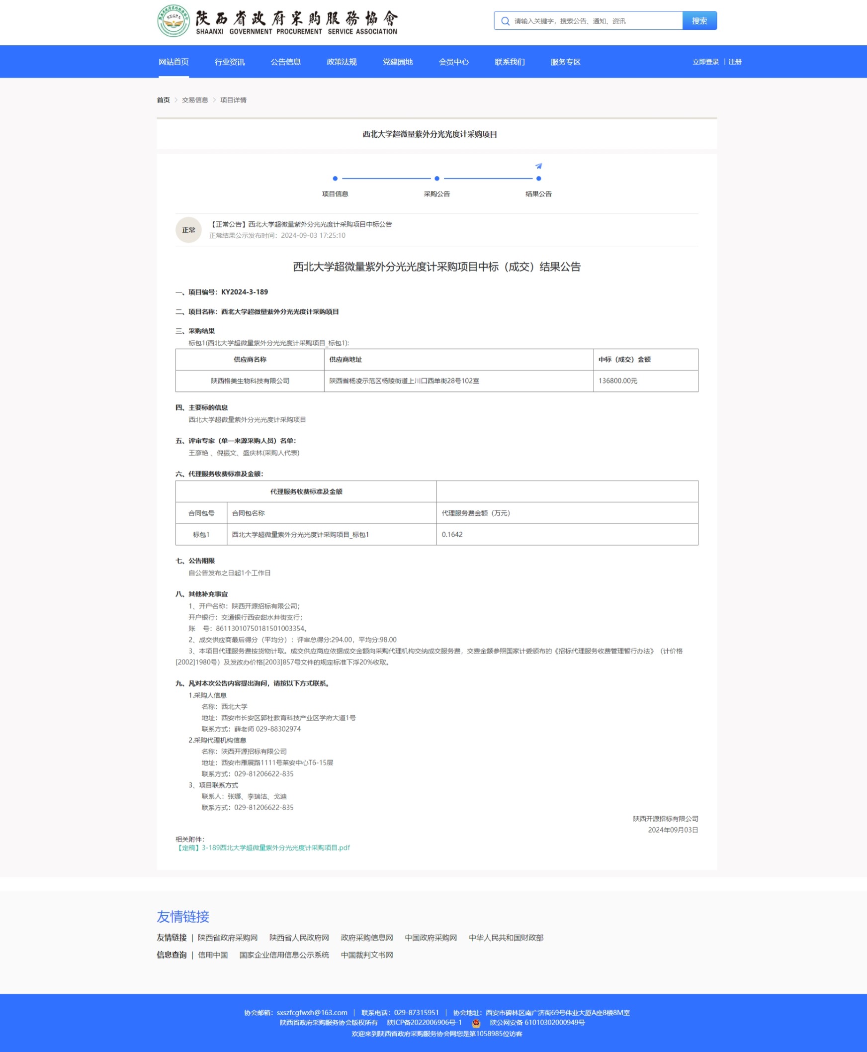 星空app官网超微量紫外分光光度计采购项目中标(成交)结果公告 作者: 编辑:采购与招标办公室 时间:2024-09-04 原公告链接:https://www.sxszfcgfwxh.cn/#/tender-vTradeAnnouncement-publicity?tenderProjectId=1826435442958446594&rootId=1549250580985765889