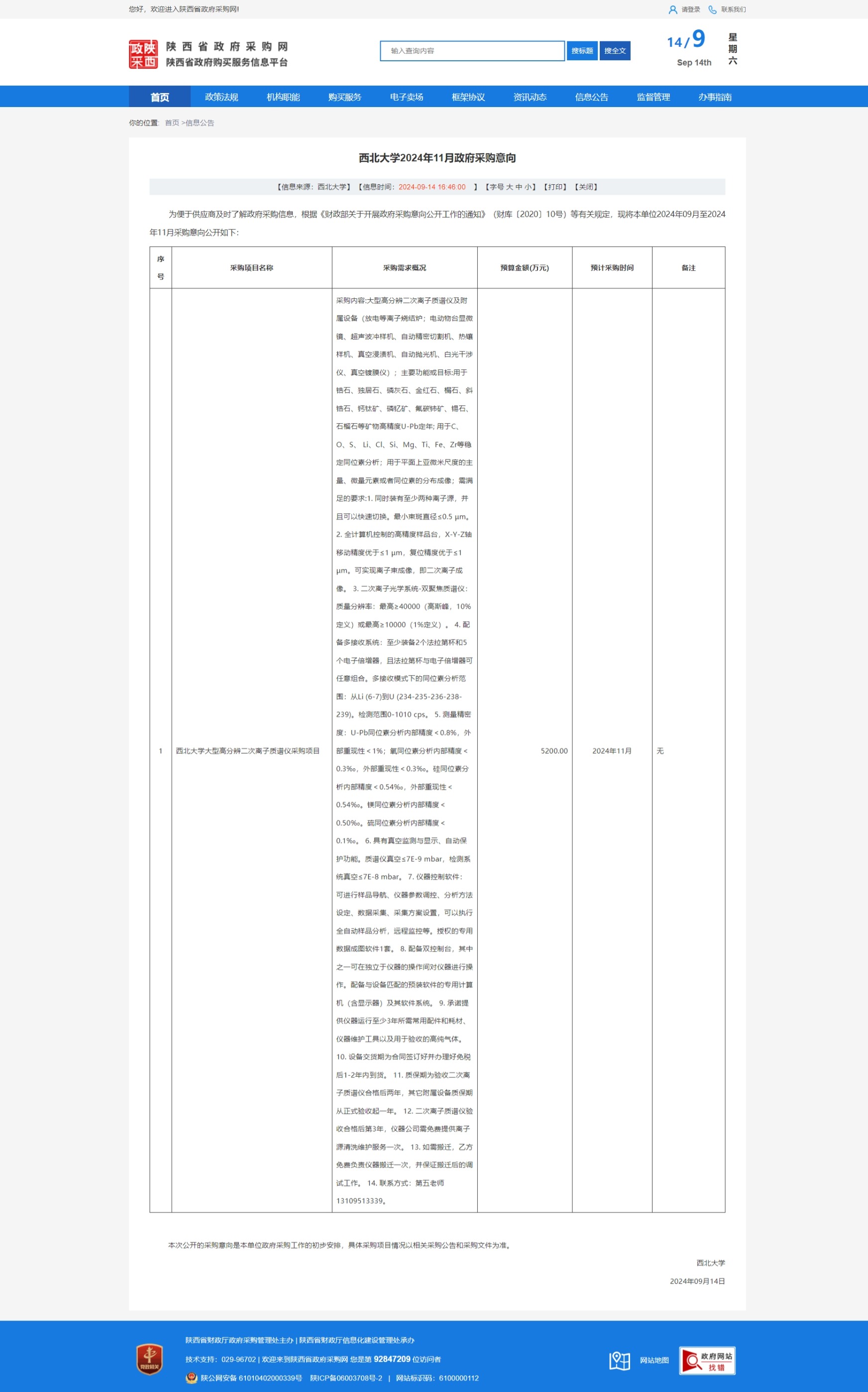 星空app官网2024年11月政府采购意向 作者: 编辑:采购与招标办公室 时间:2024-09-14 原公告链接:https://www.ccgp-shaanxi.gov.cn/freecms/site/shaanxi/ggxx/info/2024/8a69c24d91d6105a0191efadceb9269b.html?noticeType=59¬iceId=3954bd28-7277-11ef-8063-08c0eb20c666