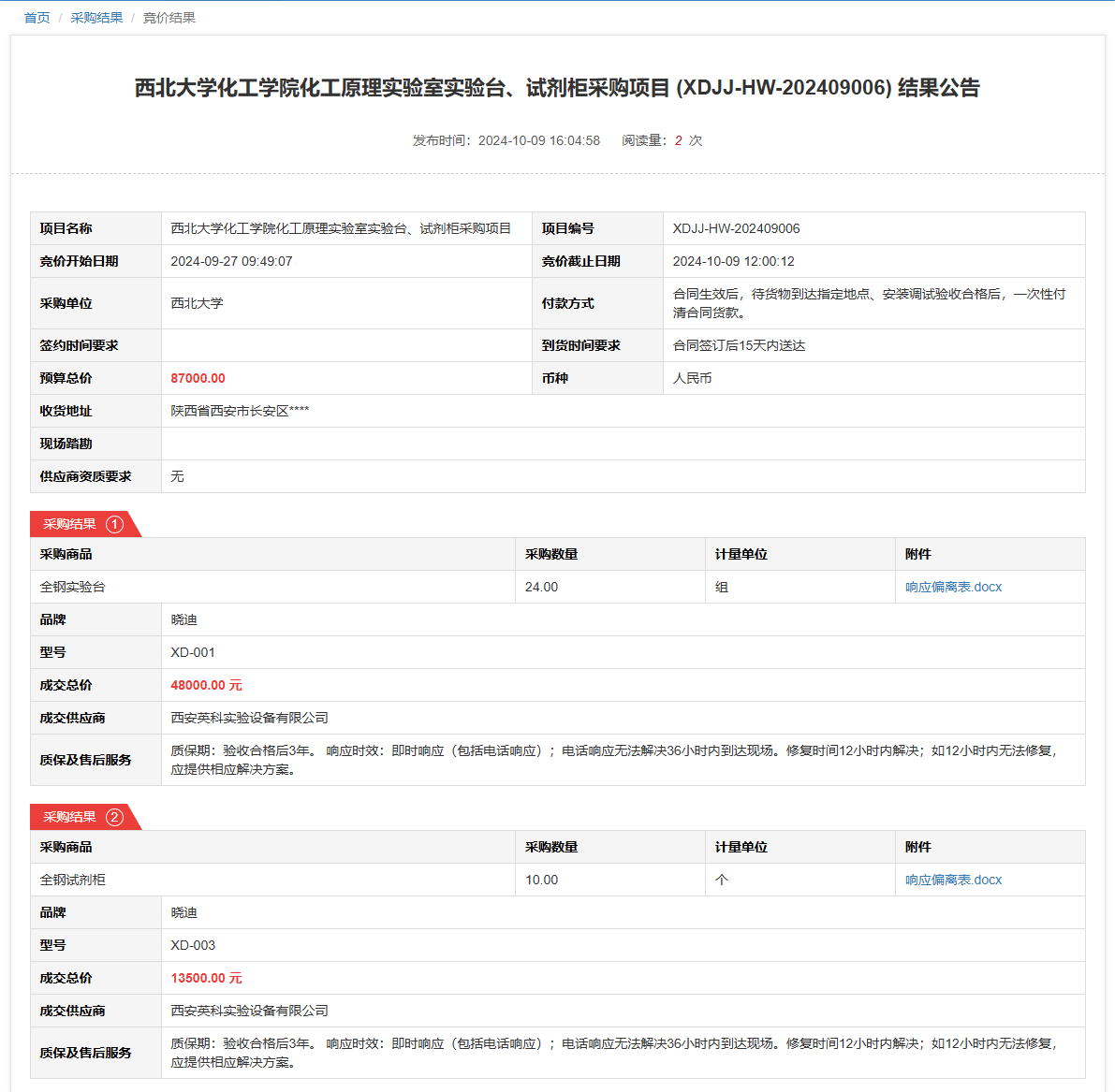 星空app官网化工学院化工原理实验室实验台、试剂柜采购项目(XDJJ-HW-202409006)竞价结果公告 作者: 编辑: 时间:2024-10-09 原公告链接:https://www.ejingcai.com.cn/site/bidding/detail/13139