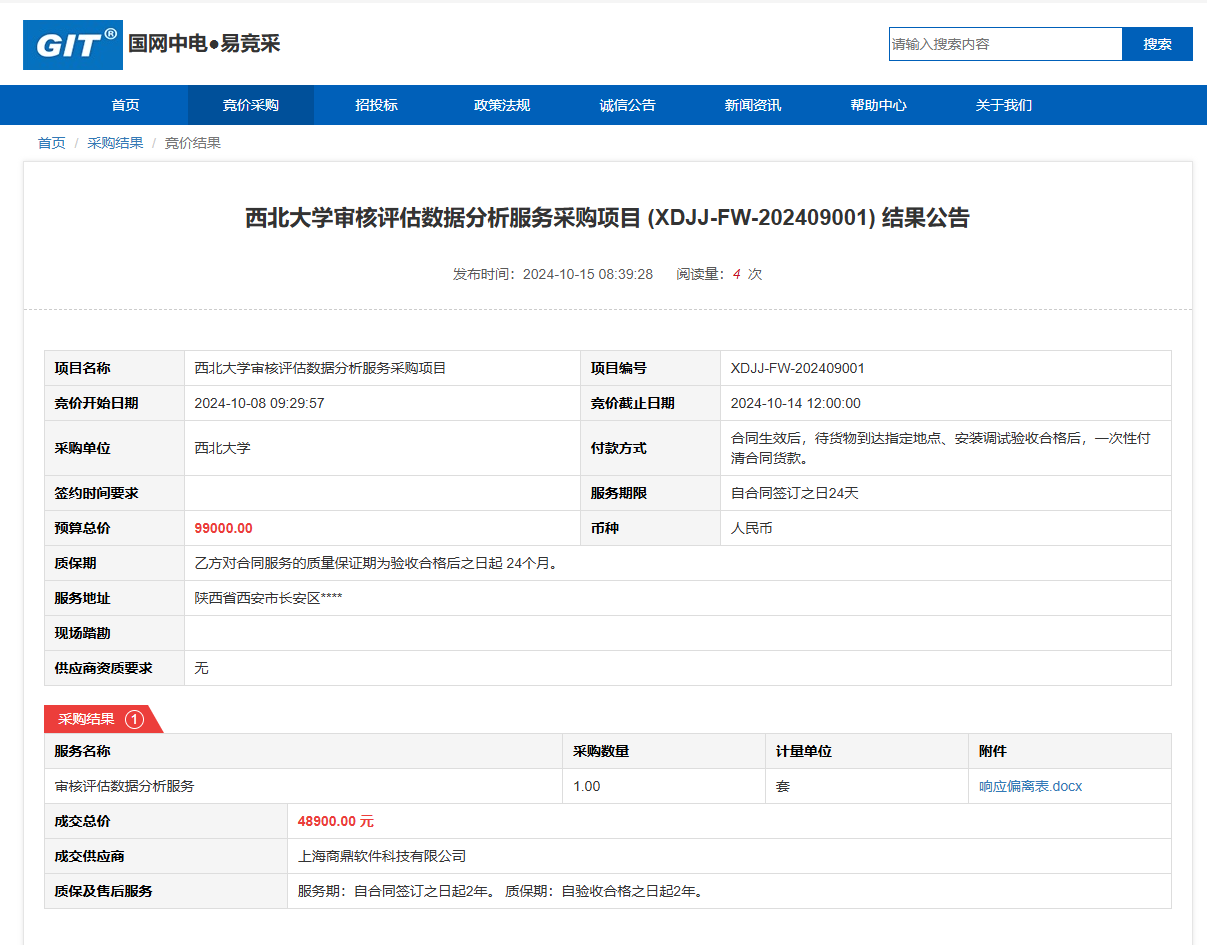 星空app官网审核评估数据分析服务采购项目(XDJJ-FW-202409001)竞价结果公告 作者:采购与招标办公室 编辑: 时间:2024-10-15 原公告链接:https://www.ejingcai.com.cn/site/bidding/detail/13296