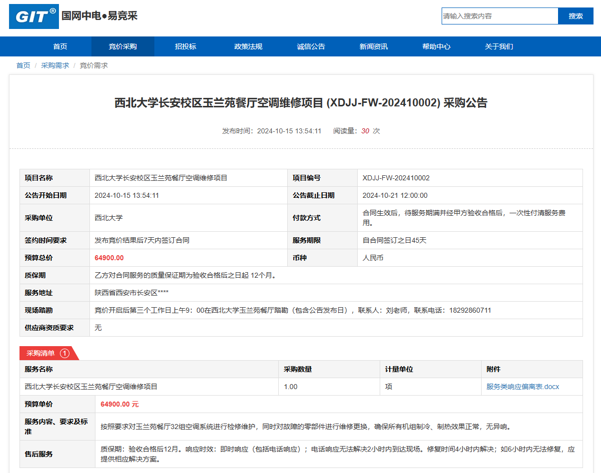 星空app官网长安校区玉兰苑餐厅空调维修项目(XDJJ-FW-202410002)竞价采购公告 作者:采购与招标办公室 编辑: 时间:2024-10-15 原公告链接:https://www.ejingcai.com.cn/site/bidding/detail/13316