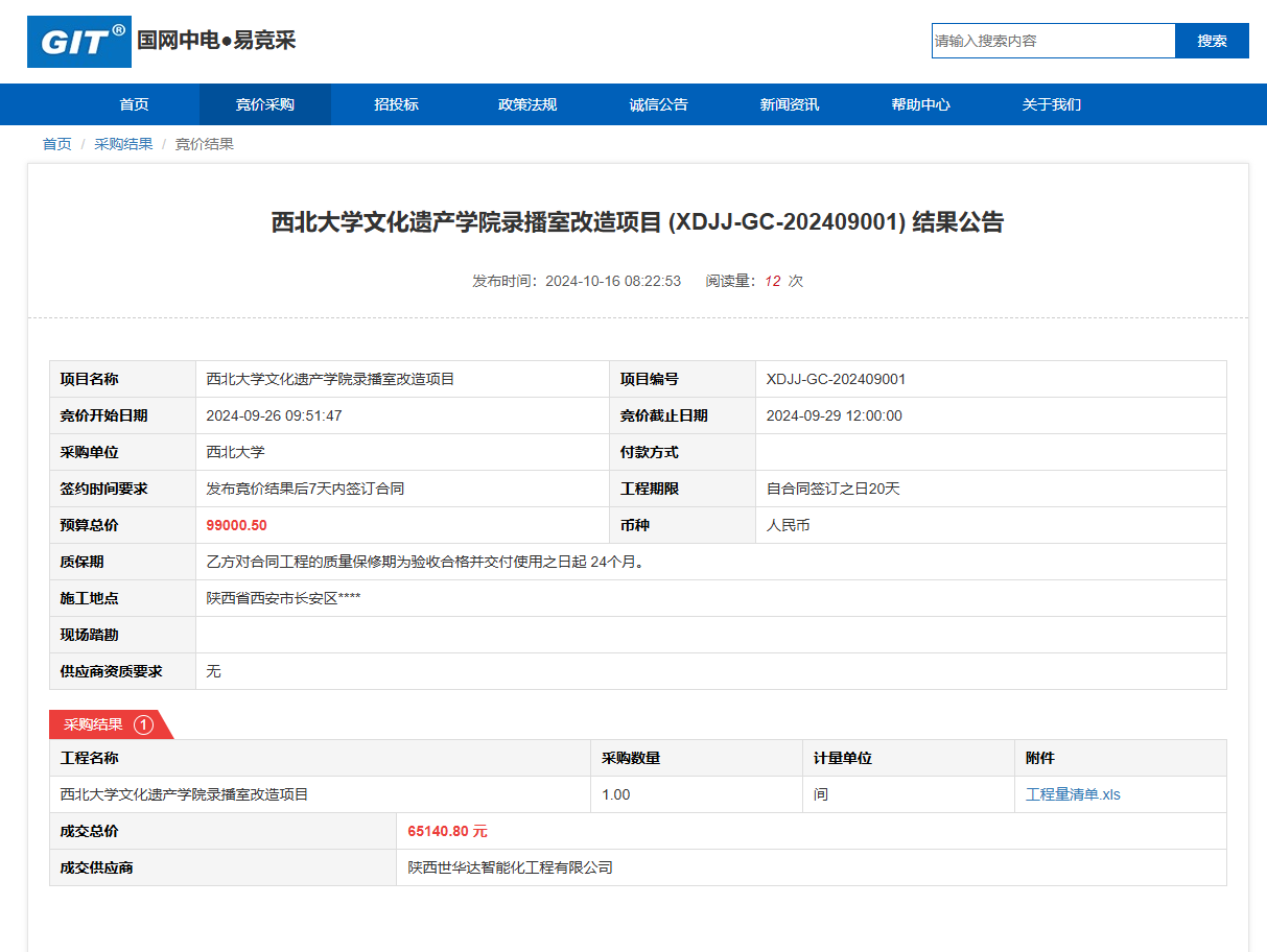星空app官网文化遗产学院录播室改造项目(XDJJ-GC-202409001)竞价结果公告 作者:采购与招标办公室 编辑: 时间:2024-10-16 原公告链接:https://www.ejingcai.com.cn/site/bidding/detail/13343