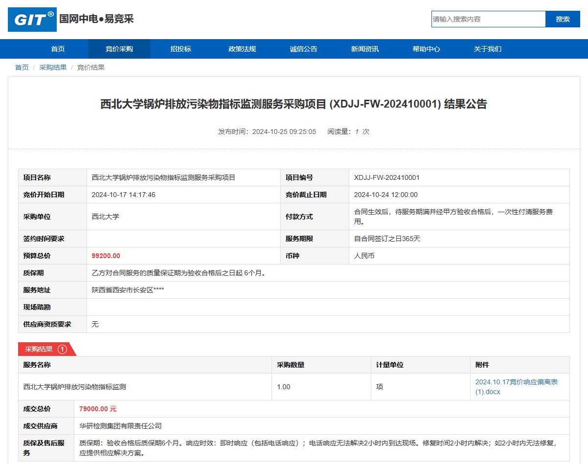 星空app官网锅炉排放污染物指标监测服务采购项目(XDJJ-FW-202410001)竞价结果公告 作者:采购与招标办公室 编辑: 时间:2024-10-25 原公告链接:https://www.ejingcai.com.cn/site/bidding/detail/13778