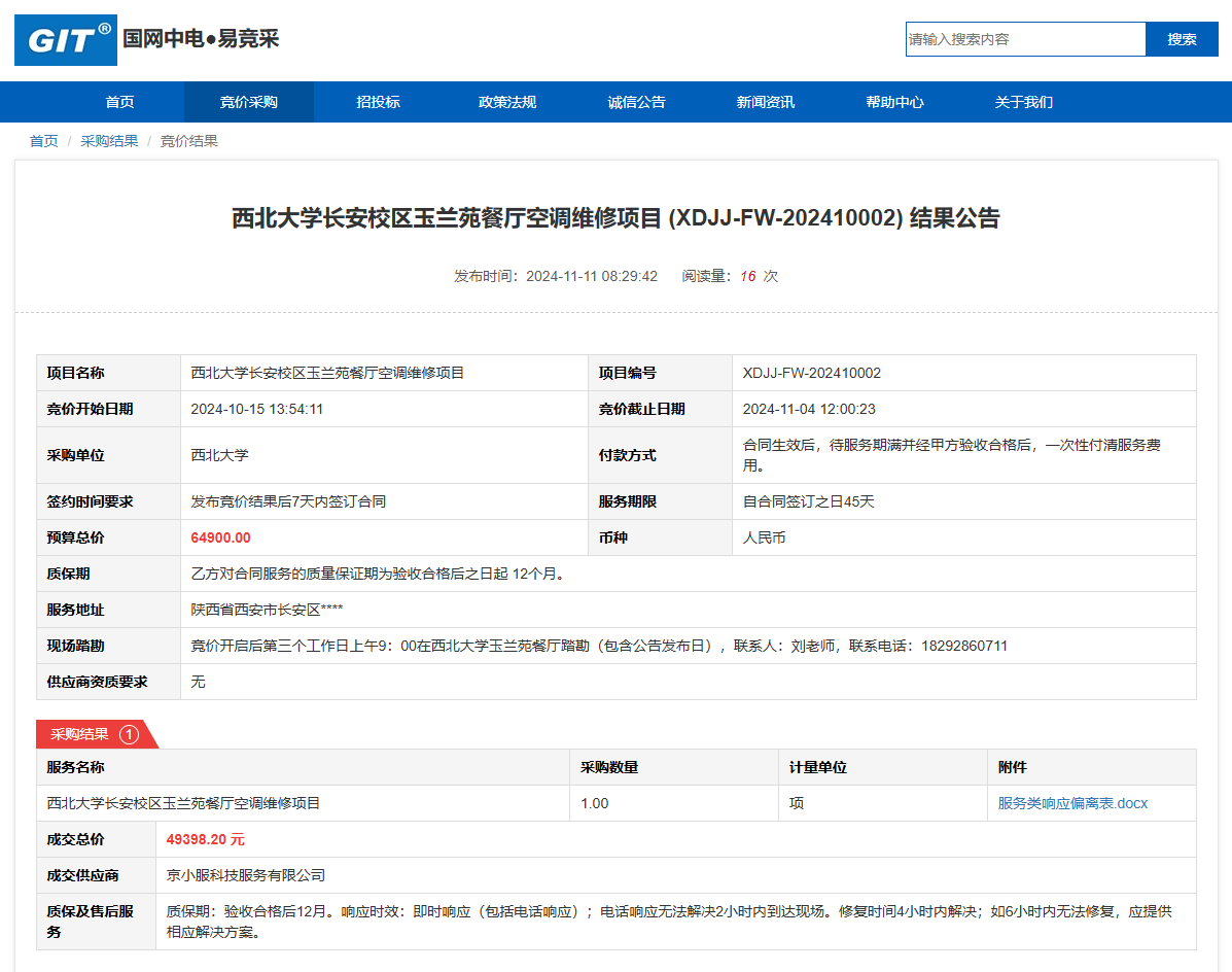 星空app官网长安校区玉兰苑餐厅空调维修项目(XDJJ-FW-202410002)竞价结果公告 作者:采购与招标办公室 编辑: 时间:2024-11-11 原公告链接:https://www.ejingcai.com.cn/site/bidding/detail/14578