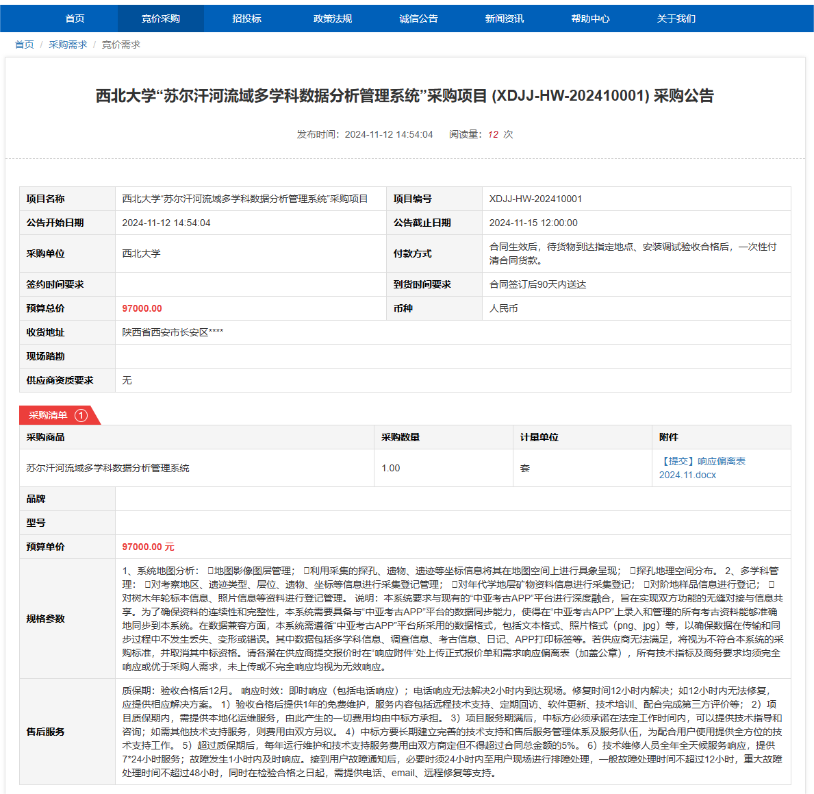 星空app官网“苏尔汗河流域多学科数据分析管理系统”采购项目(XDJJ-HW-202410001)竞价采购公告 作者:采购与招标办公室 编辑: 时间:2024-11-12 原公告链接:https://www.ejingcai.com.cn/site/bidding/detail/14753
