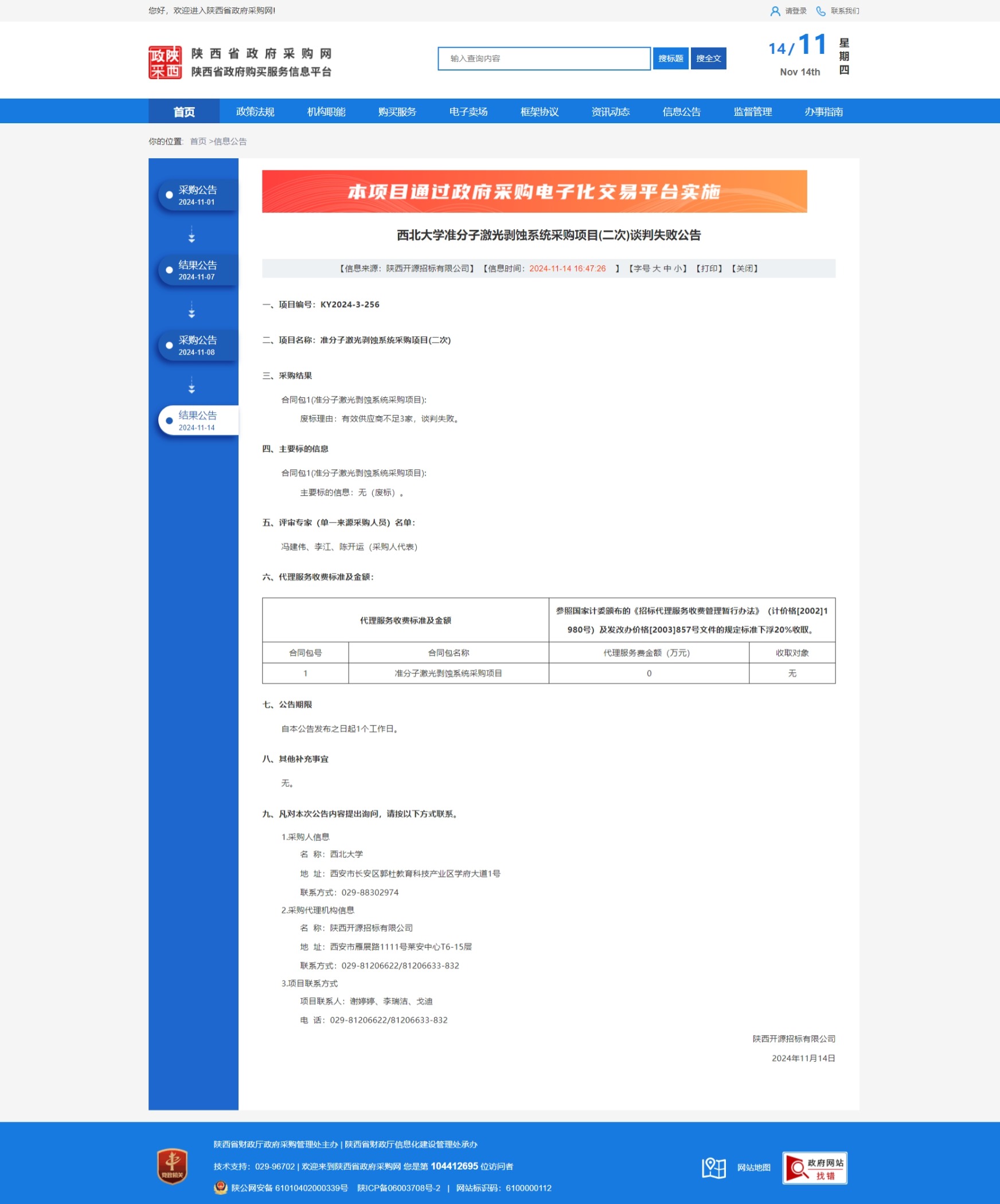 星空app官网准分子激光剥蚀系统采购项目(二次)谈判失败公告 作者: 编辑:薛利娟 时间:2024-11-14 原公告链接:https://www.ccgp-shaanxi.gov.cn/freecms/site/shaanxi/ggxx/info/2024/8a69c44e9218572b019329d196666b38.html?noticeType=001006¬iceId=a4a84f2c-a266-11ef-8063-08c0eb20c666